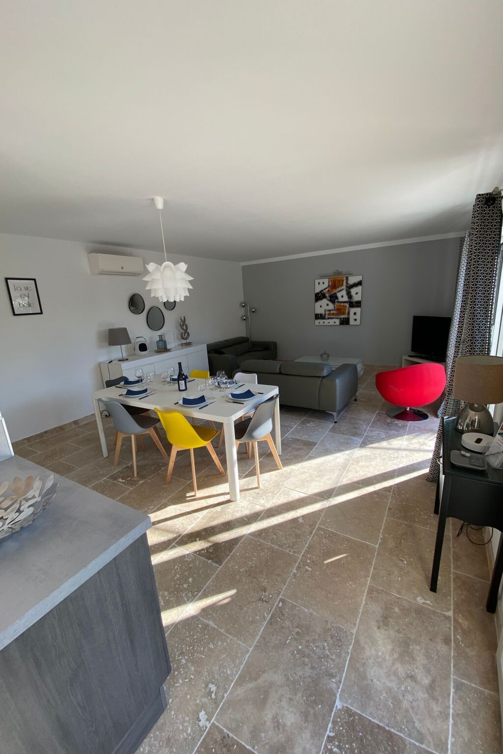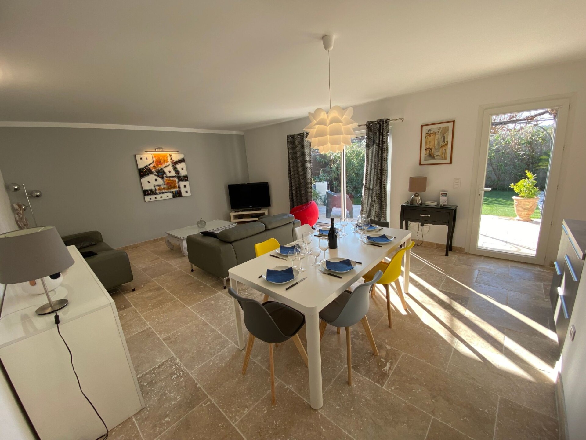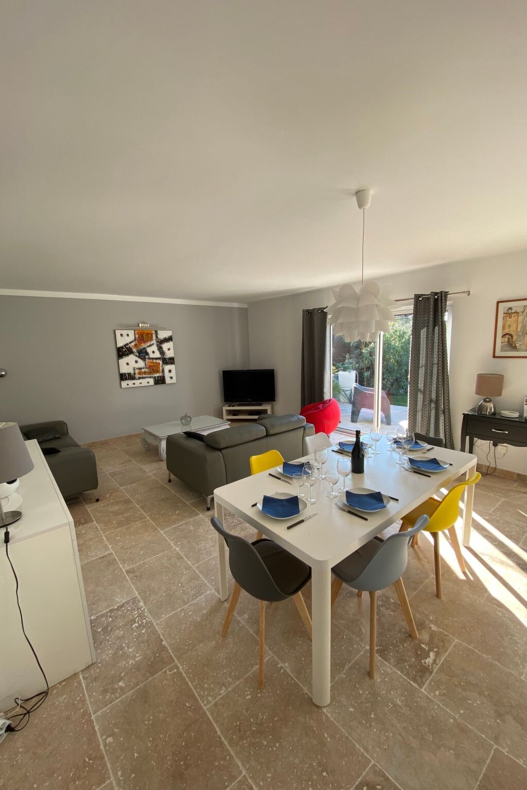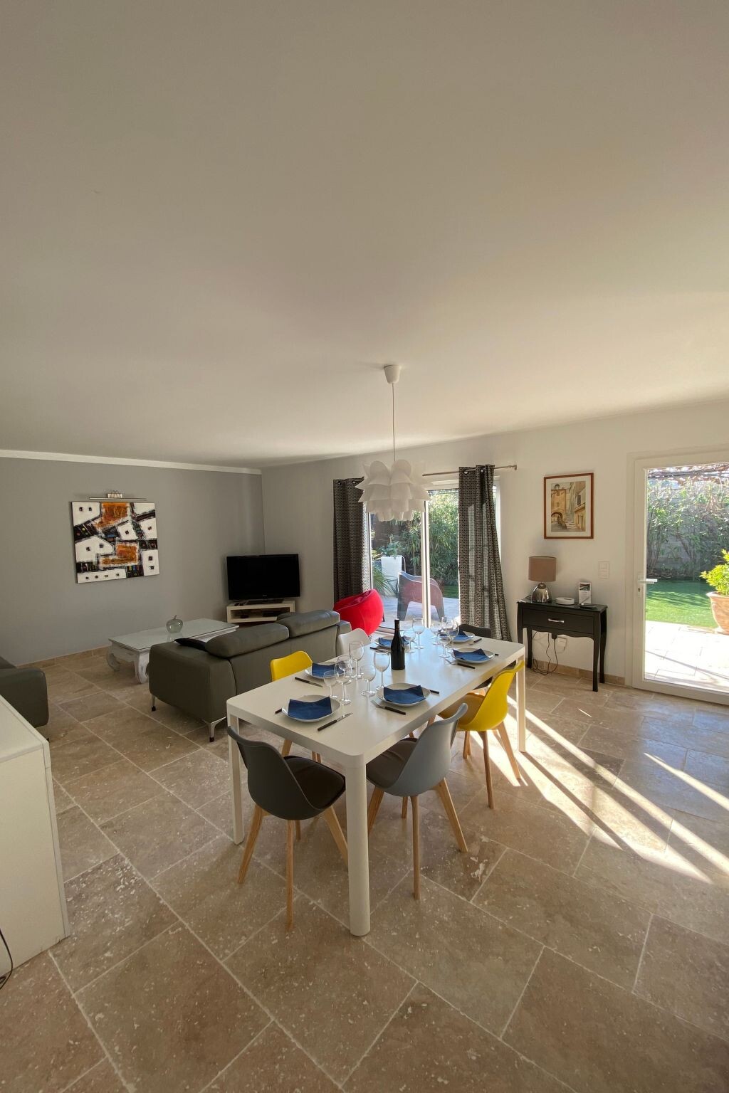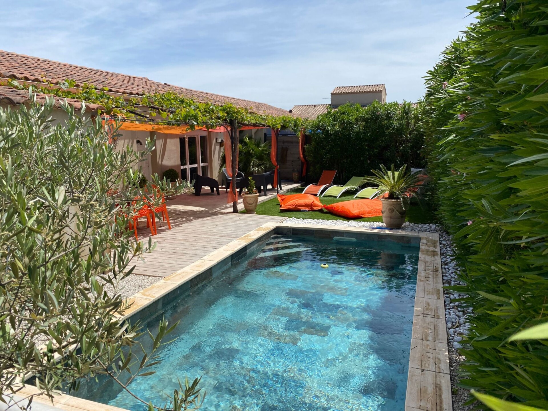 Bright, modern villa with heated pool in Provence, 10 km from Avignon Located in Tavel, a small Gard village renowned for its rosé wine in the heart of the Tavel, Lirac and Châteauneuf du Pape vineyards. Just 10 km from Avignon, the Pont du Gard and Orange. It's the ideal base for exploring Provence (Les Baux de Provence, Saint Rémy de Provence, Le Lubéron) and the many other tourist attractions in the region: Drôme provençale, Uzès, Vallée de la Cèze, la Camargue, les Calanques de Cassis .... The villa is in a quiet, pleasant residential area, at the end of a cul-de-sac. It is a 5-minute walk from the village centre and a few minutes from footpaths and cycle paths. Dogs are allowed and the garden is fully fenced.New 100 m2 ground-floor villa for 6 people: open-plan kitchen, dining/living room opening onto covered terrace and swimming pool, 1 master suite with shower and washbasin (160 cm double bed), 1 bedroom (160 cm double bed), 1 bedroom with 160 cm double bed, bathroom, air-conditioned villa in the day area (kitchen, dining room and living room).Fully fenced property planted with oleanders. Large shaded terrace with dining table, barbecue and garden furniture (4 armchairs) and 4 deckchairs 2 fatboys Heated swimming pool (April to October), secured with a 3*6 m cover and 1.20 metre deep.Household linen (sheets and towels) Beds are made on arrival and the pool is serviced once a week by the owner. The house is equipped with a cot and high chair.Ideal location for enjoying the villa and swimming pool and discovering the many tourist attractions in the region at your own pace. 2770977