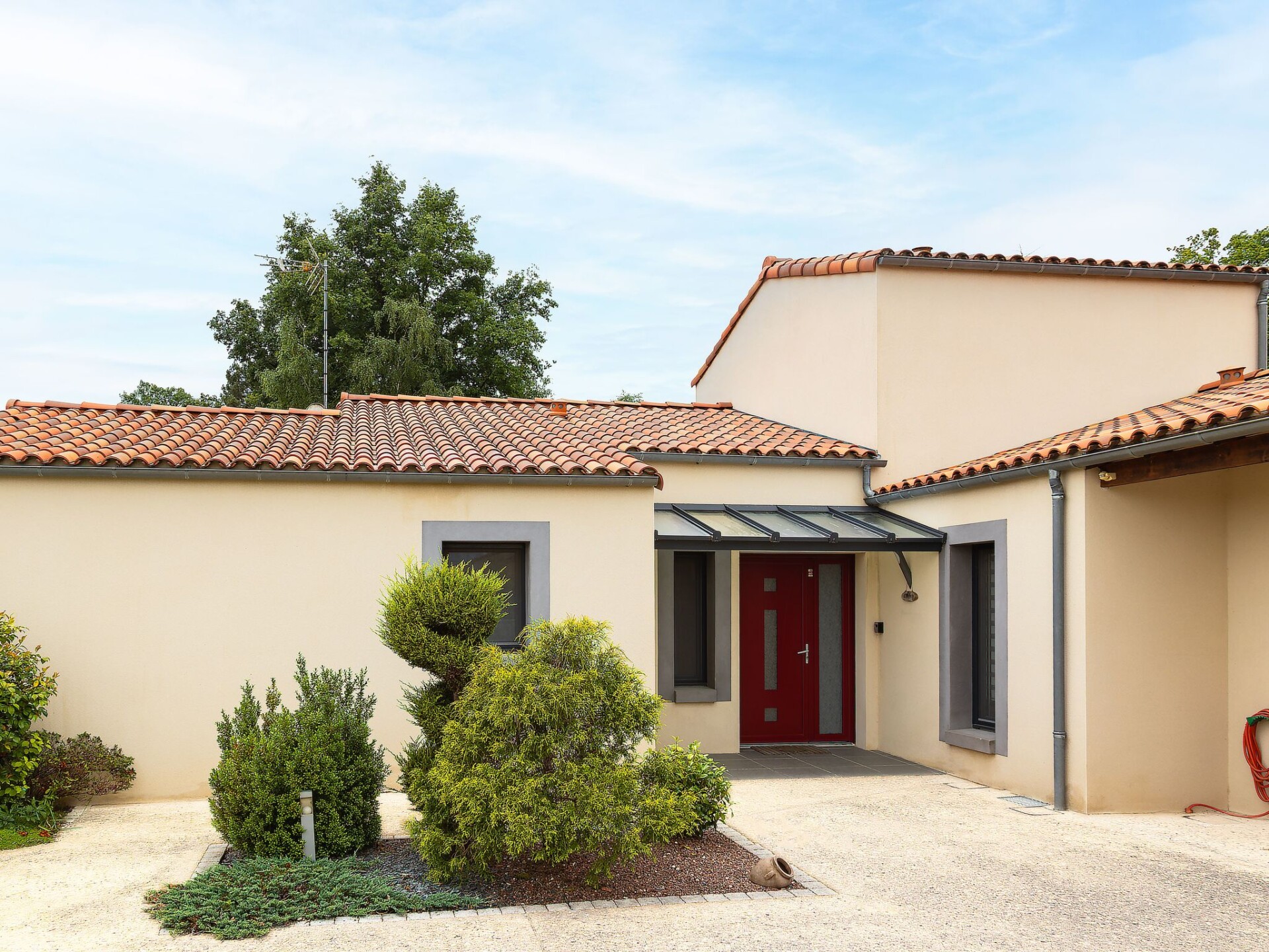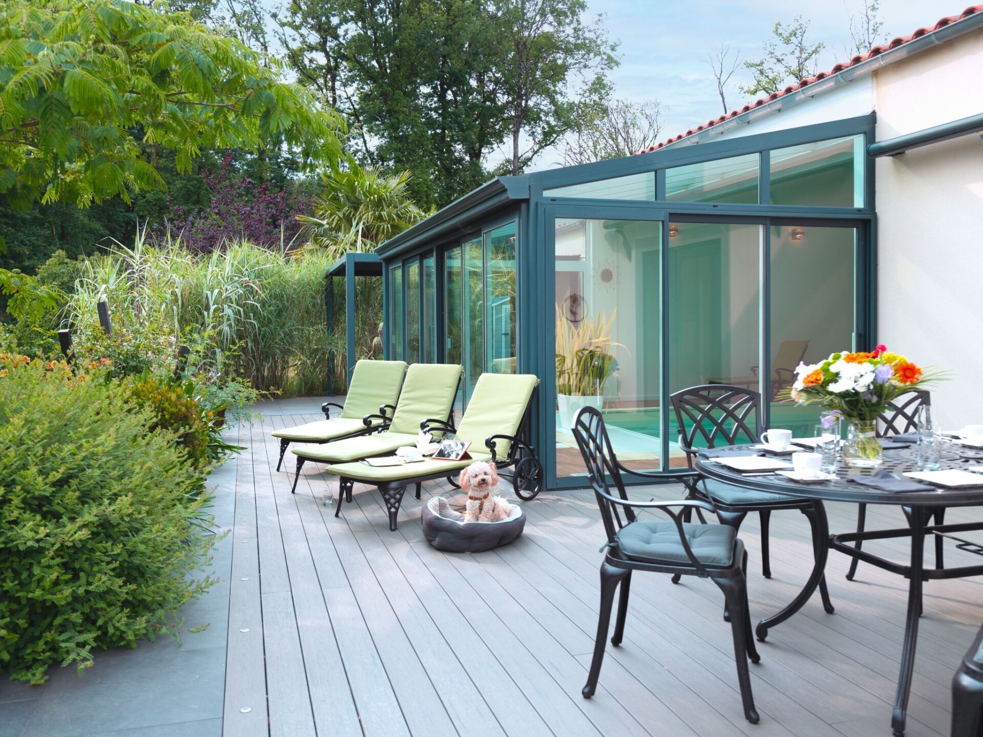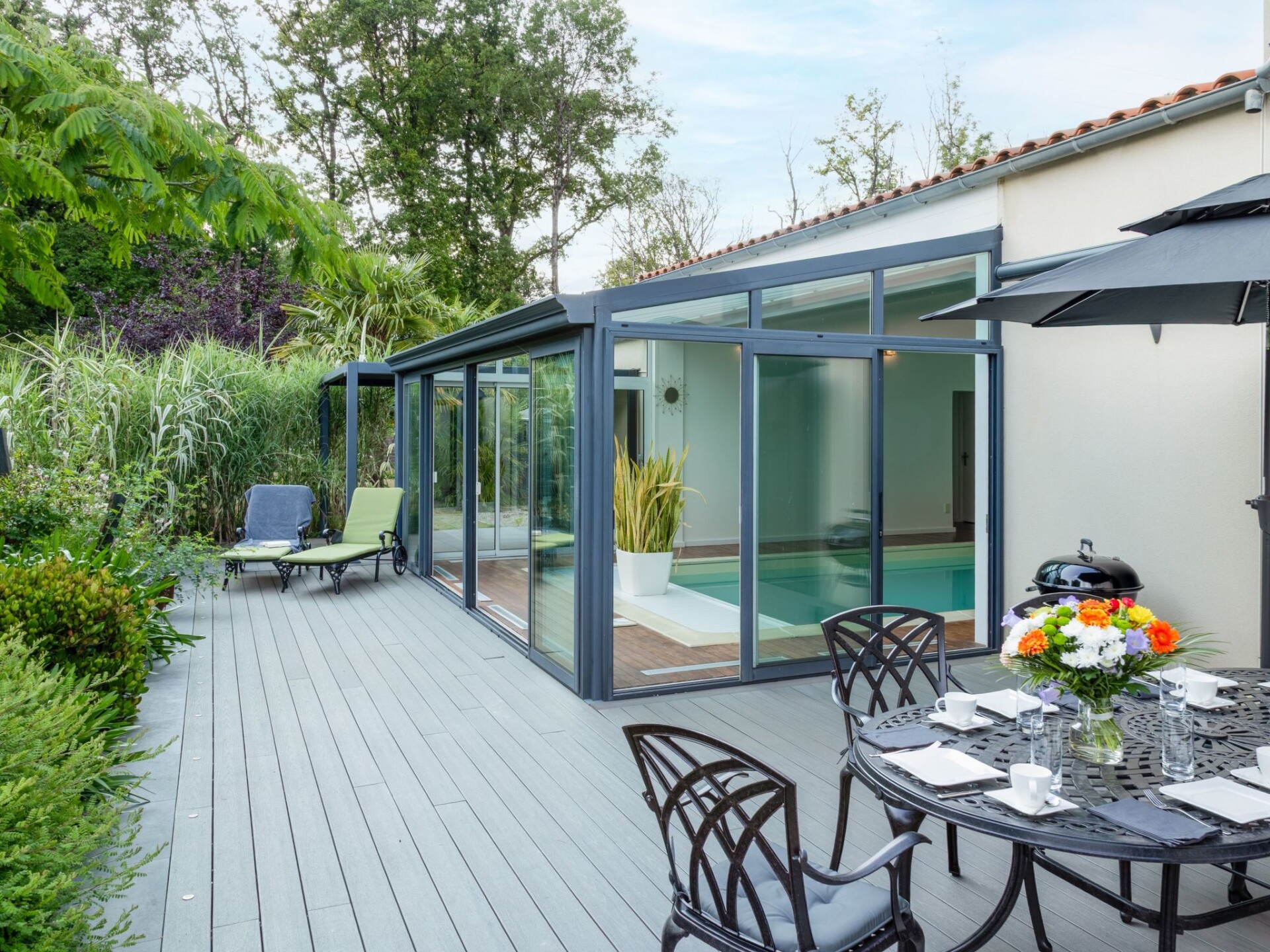 Maximaal 2 huisdieren/honden toegestaan. Discover the breathtaking tranquillity and exclusivity of the modern 5* Villa DUXCAAR, perfectly located at the end of a cul-de-sac and surrounded by almost 2,000 square metres of woodland. This luxurious accommodation is the ideal choice for an unforgettable holiday, with an environmentally friendly, climate-neutral heated indoor pool as a highlight that invites you to relax.Inside the villa, you will find high-quality furnishings that leave nothing to be desired. A spacious living room with adjoining kitchen offers everything you need for socialising and cooking together. The sleeping areas are skilfully distributed and offer privacy for all guests: from the master bedroom with a large bathroom and dressing room, to two bedrooms with en suite bathrooms and direct pool access, to a further bedroom and study on the 1st floor. The heated indoor pool with over 40,000 litres of water is always available for a refreshing break.The outdoor area is no less impressive. Several terraces facing south, west and east, including a barbecue area, outdoor shower and covered areas, invite you to linger in the open air. The spacious garden offers both retreats for quiet moments with a book and play areas for younger guests.The villa's location is ideal for exploring the surrounding area. Set off on extensive hikes in the "Foret de Mervent", one of the largest contiguous forest areas in western France. Whether you want to spend a day by the Atlantic Ocean, visit historic towns such as La Rochelle or the Ile-de-Ré or enjoy the charm of small, picturesque villages - the central location makes it all possible. Golf lovers, canoeing enthusiasts and surfers will also find a wealth of activities in the immediate vicinity.Villa DUXCAAR is your exclusive oasis for a dream holiday in the heart of western France. Here, luxurious comfort is combined with the unspoilt beauty of nature and numerous leisure activities. A perfect choice for travellers looking for both relaxation and exciting adventures. 3945722