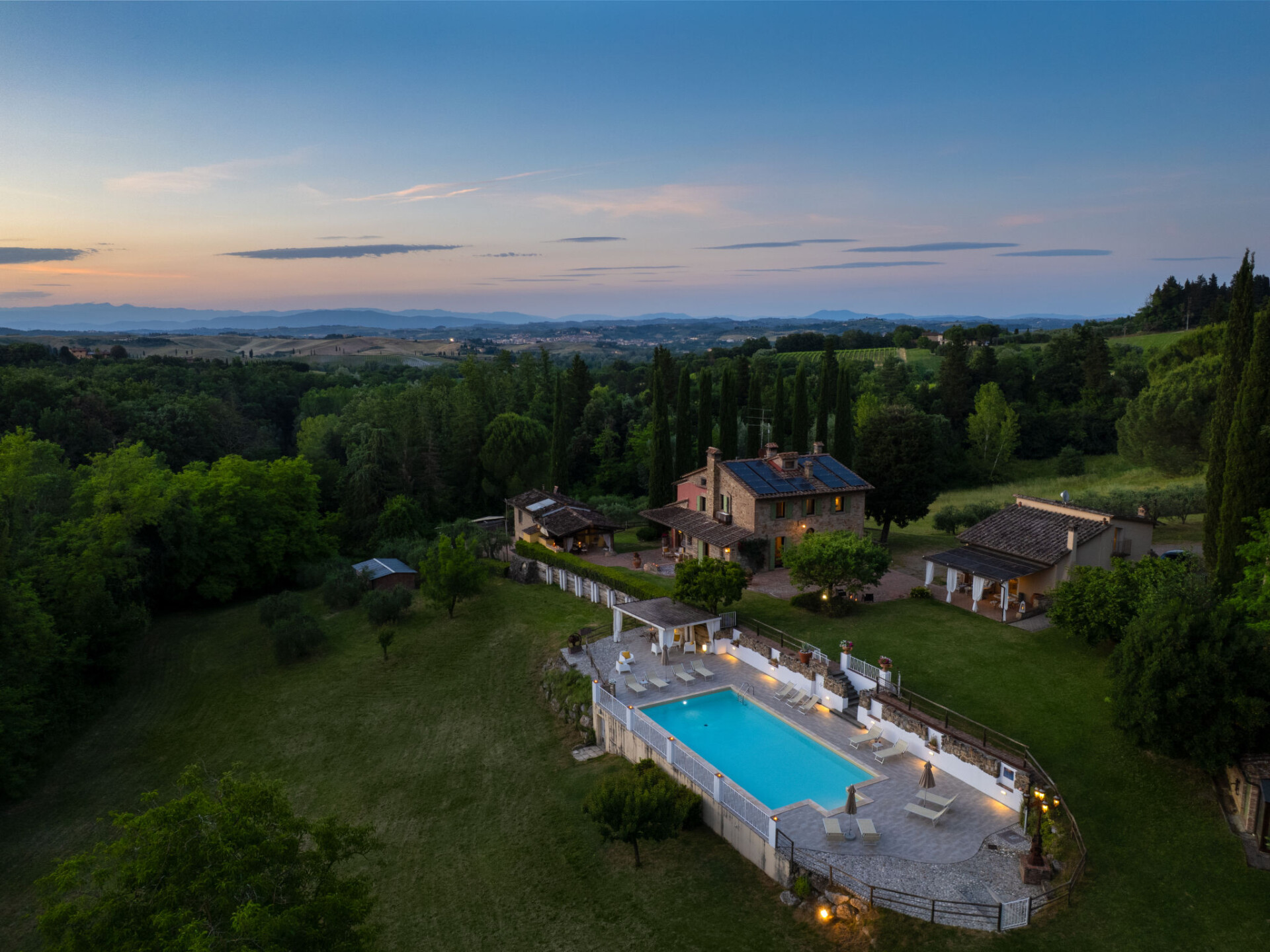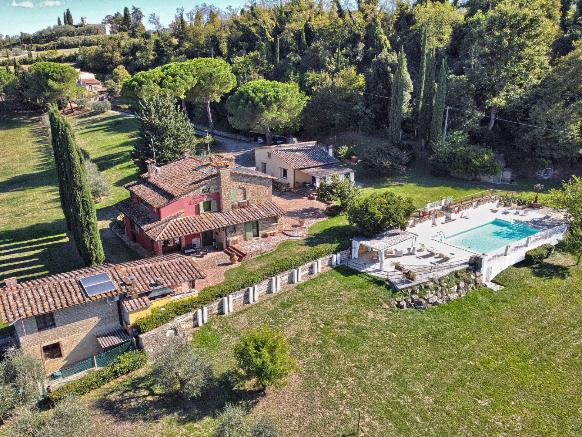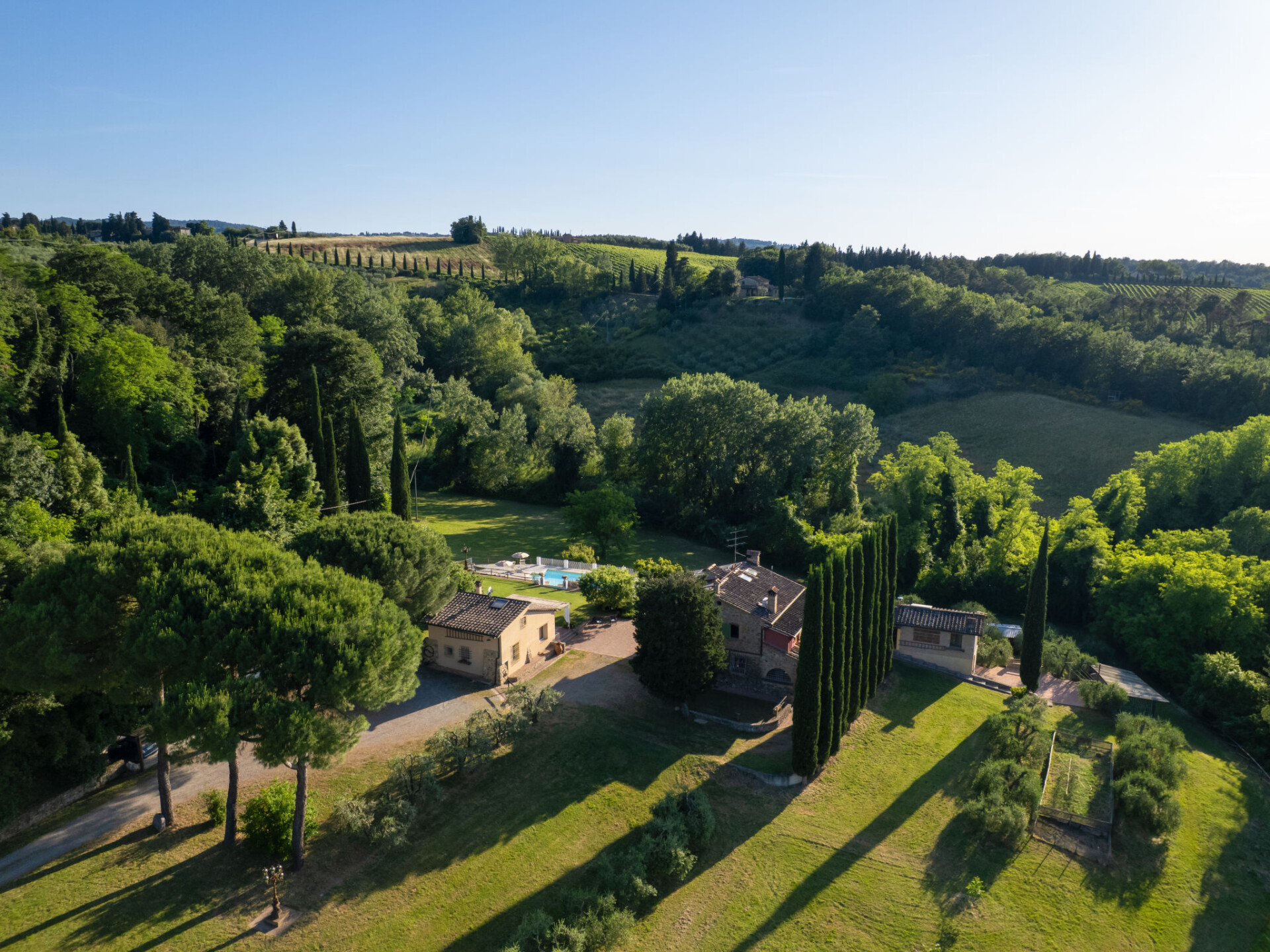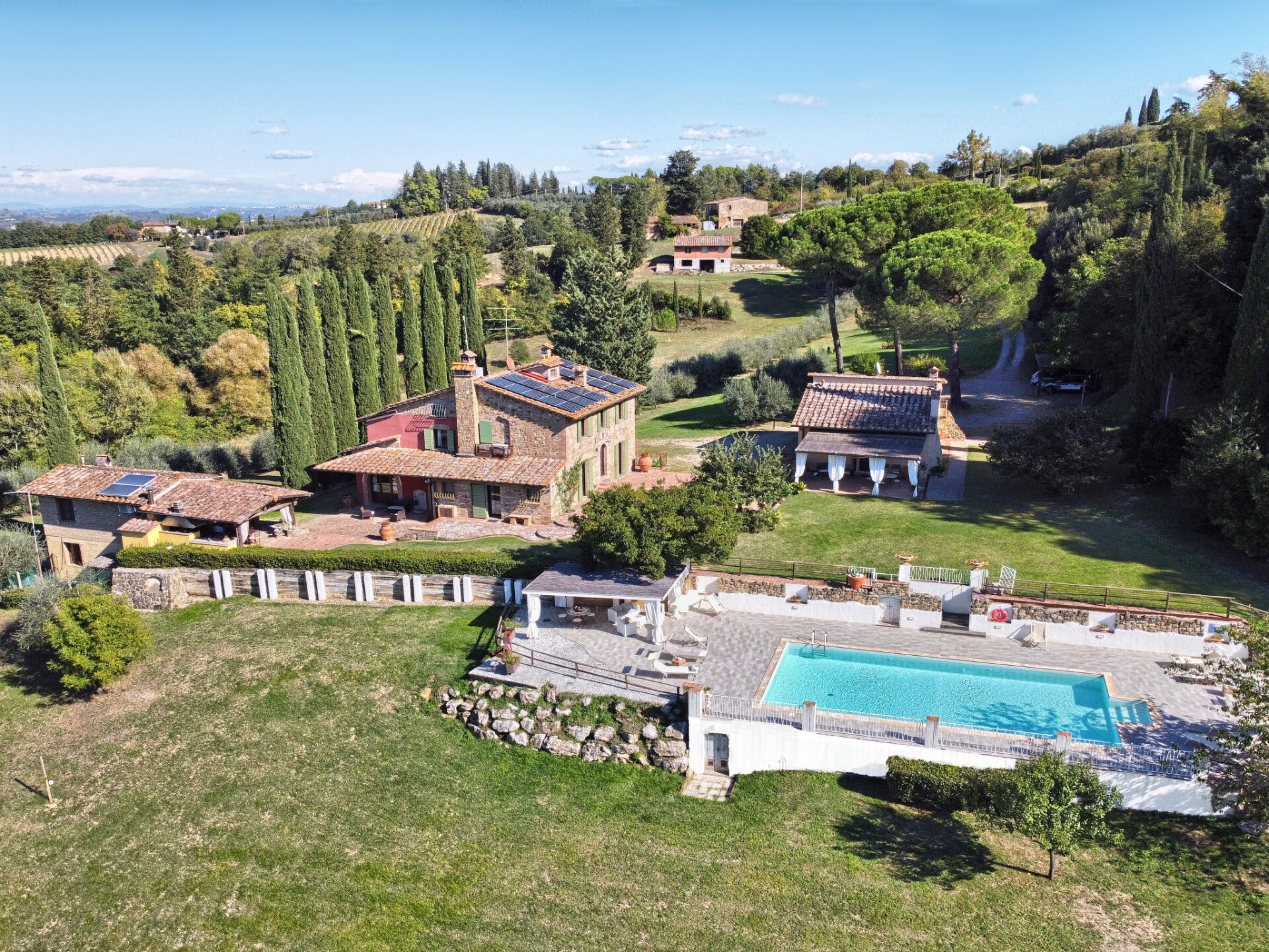 Zeer mooi, comfortabele villa "Fonte di Pillo", omgeven door velden en wijngaarden. Huurobject bestaande uit hoofd-/ bijgebouw, 4 km van het centrum van Gambassi Terme, 4 km van het centrum van Castelfiorentino, 20 km van het centrum van San Gimignano, rustige ligging. Voor alleengebruik: terrein 60.000 m2, verzorgde tuin (niet omheind) met gazon en bomen, openluchtzwembad (12 x 6 m, 150 cm diepte, seizoensgebonden beschikbaarheid: 01.Mei. - 18.Okt.). Buitendouche, terras, tuinmeubelen, barbecue, onderhoud zwembad door de eigenaar/tuinman. In het huis: air-conditioning, alarmsysteem. 200 m lange toegangsweg (onverharde weg). Overdekte parkeerplaats op het terrein. Oplaadstation. Supermarkt 4 km, bushalte 300 m, treinstation "Castelfiorentino" 6 km. Golfterrein (18 holes) 15 km. Attracties in de buurt: Volterra 30 km, Firenze 40 km, Pisa 60 km, Livorno 70 km. Baby uitrusting (incl.). Groepen jongeren uitsluitend op aanvraag.