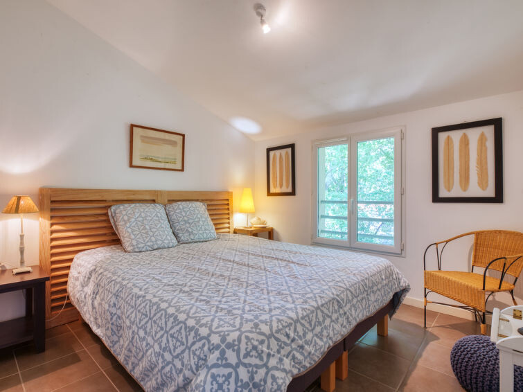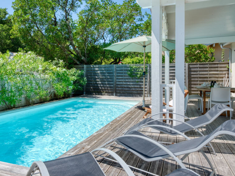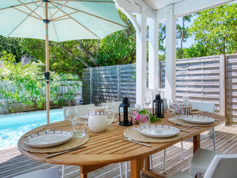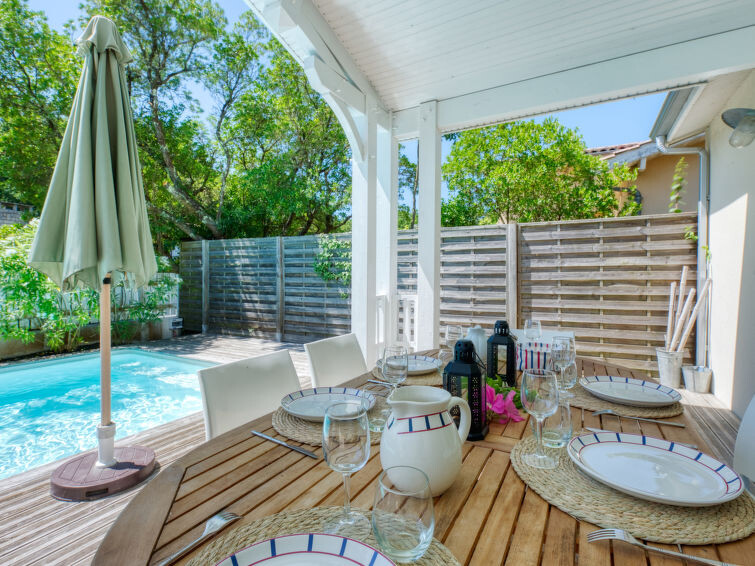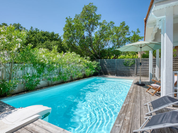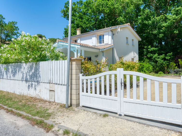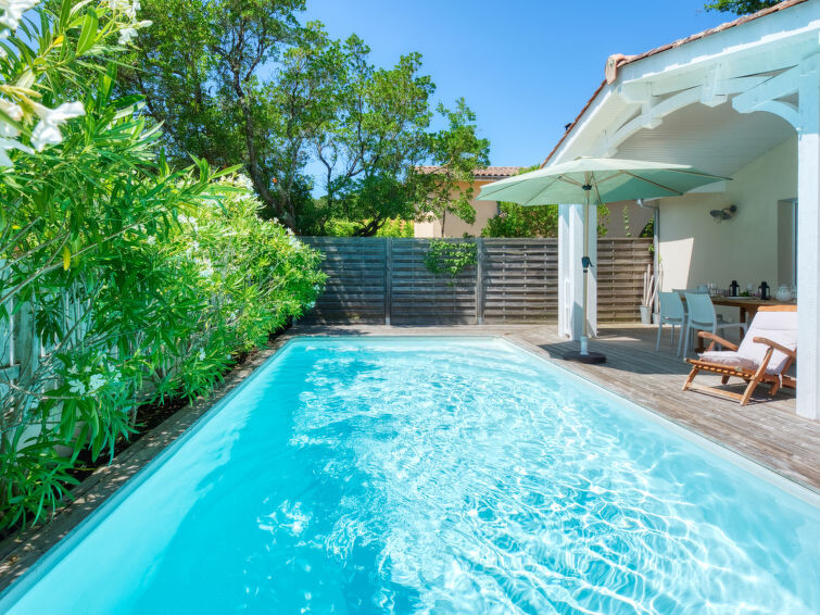 Villa "du Lac", bouwjaar 2014. In het gehucht Les Bainasses, 5 km van het centrum van Lacanau-Ville, 7 km van het centrum van Lacanau-Océan, 52 km van het centrum van Bordeaux, 100 m van het meer, 7 km van het strand, aan een doodlopende weg. Voor alleengebruik: verzorgde tuin 300 m2 (omheind) met planten, openluchtzwembad (7 x 3 m, seizoensgebonden beschikbaarheid: 26.Apr. - 27.Sep.) met alarminstallatie. Buitendouche, terras, parkeerplaats (voor 2 auto's) bij het huis op het terrein. Winkel 5 km, bushalte "Le huga" 4 km, zandstrand "Lacanau-Océan" 7 km, meer (zwemmen) "Etang de Lacanau" 400 m. Golfterrein (18 holes) 4 km.