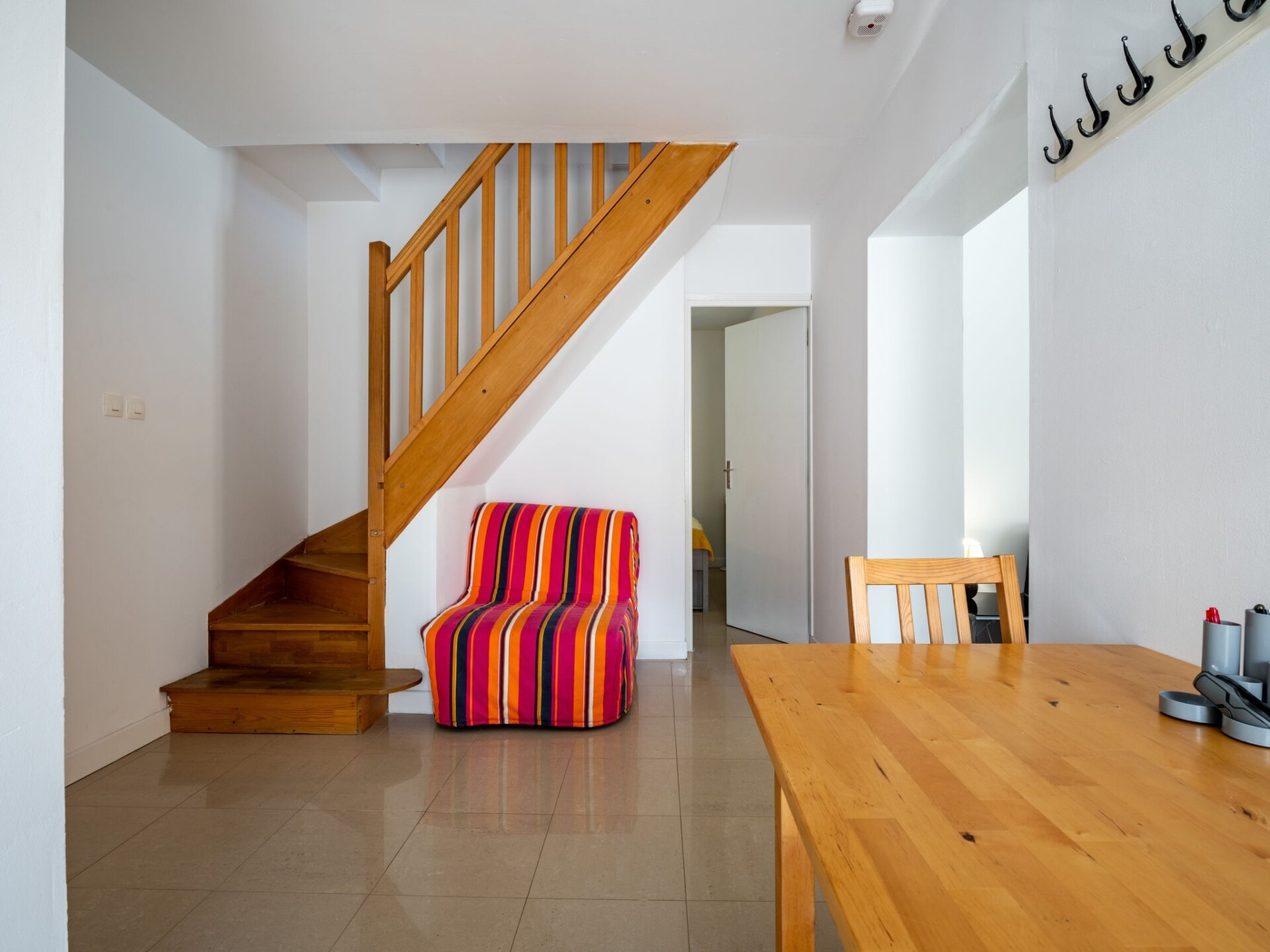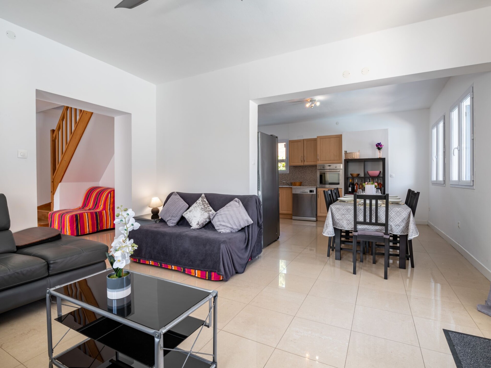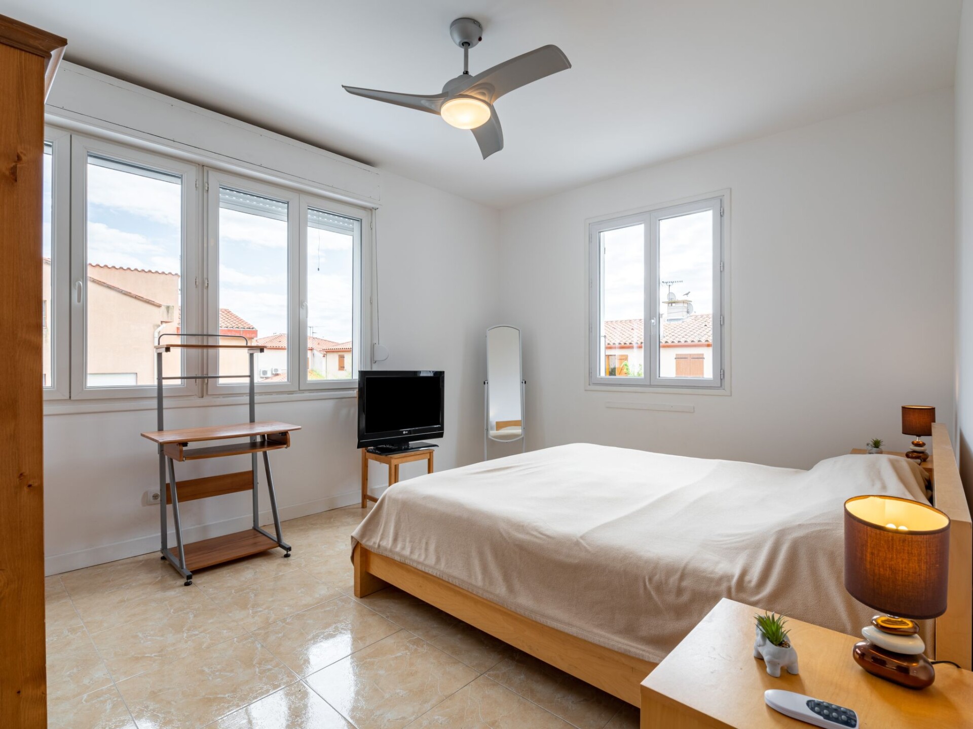 Huis 5-kamers 130 m2 op 2 verdiepingen. Doelmatig en mooi ingericht: woon-/eetkamer met TV (Flatscreen TV). Uitgang naar het terras. 1 kamer met 1 2-pers bed (160 cm, lengte 190 cm), ventilator. Kookhoek (oven, afwasmachine, 4 keramische glas kookplaten, broodrooster, waterkoker, magnetron, diepvriezer, elektrische koffiemachine). Douche/WC. Bovenverdieping: 1 kamer met 1 2-pers bed (140 cm, lengte 190 cm), air-conditioning. 1 kamer met 1 2-pers bed (180 cm, lengte 200 cm), air-conditioning. 1 kamer met 2 bedden (90 cm, lengte 190 cm), air-conditioning. Bad/douche/WC. Terras 80 m2, overdekt, op het westen gelegen. Terrasmeubelen, barbecue, ligstoelen (7). Ter beschikking: wasmachine, kinderstoel, kinderbed. Internet (Internet (WiFi), gratis). Rookmelders. Aanbod door een particulier volgens art. 155, IV van CGI.