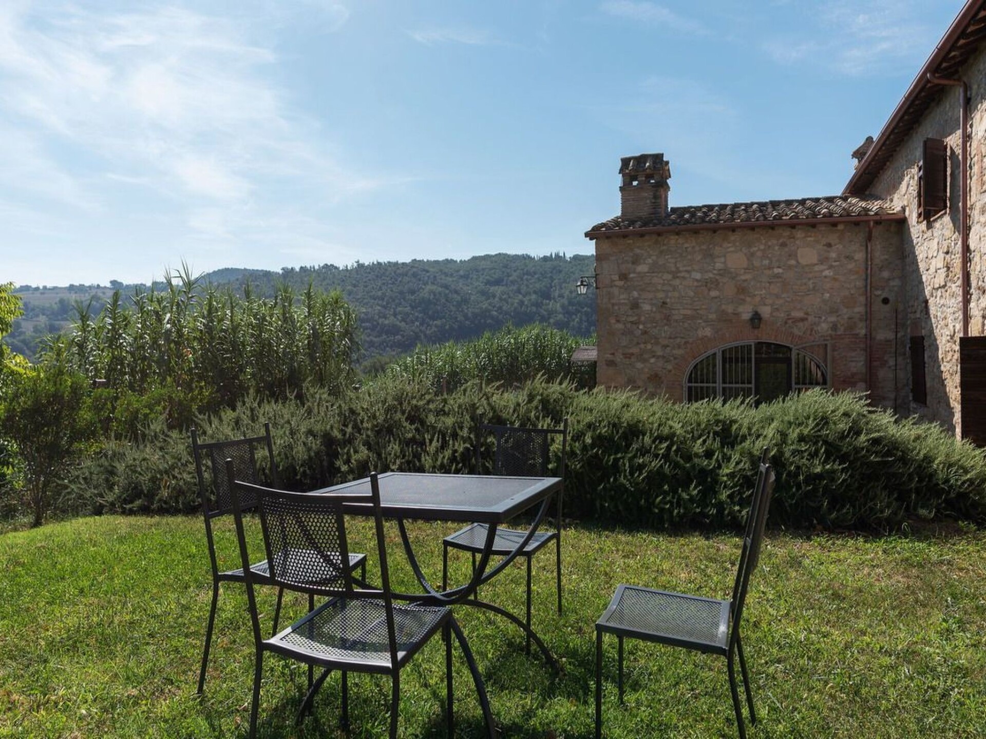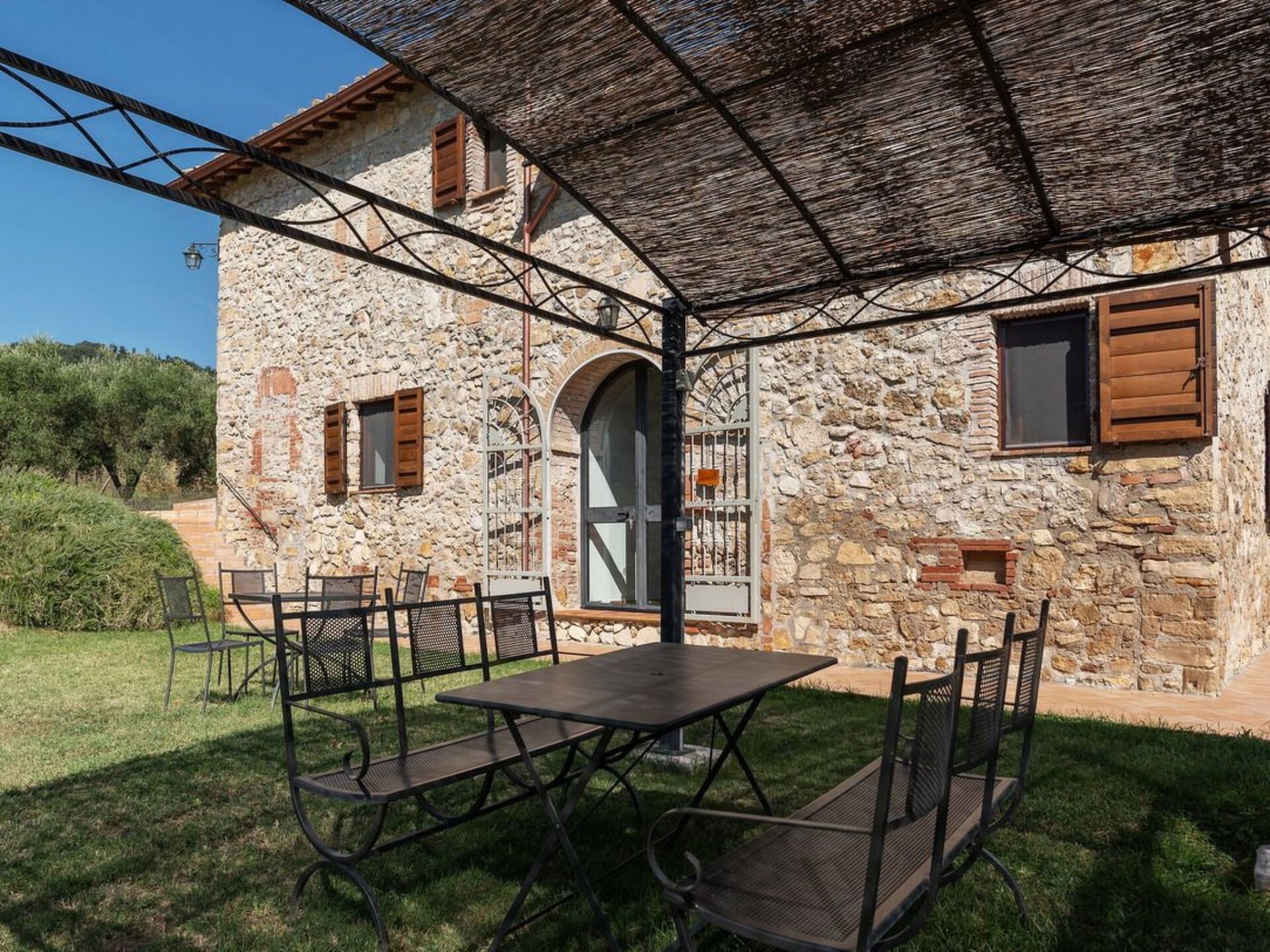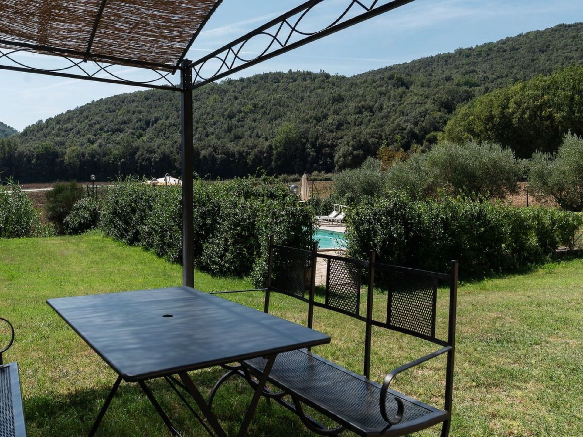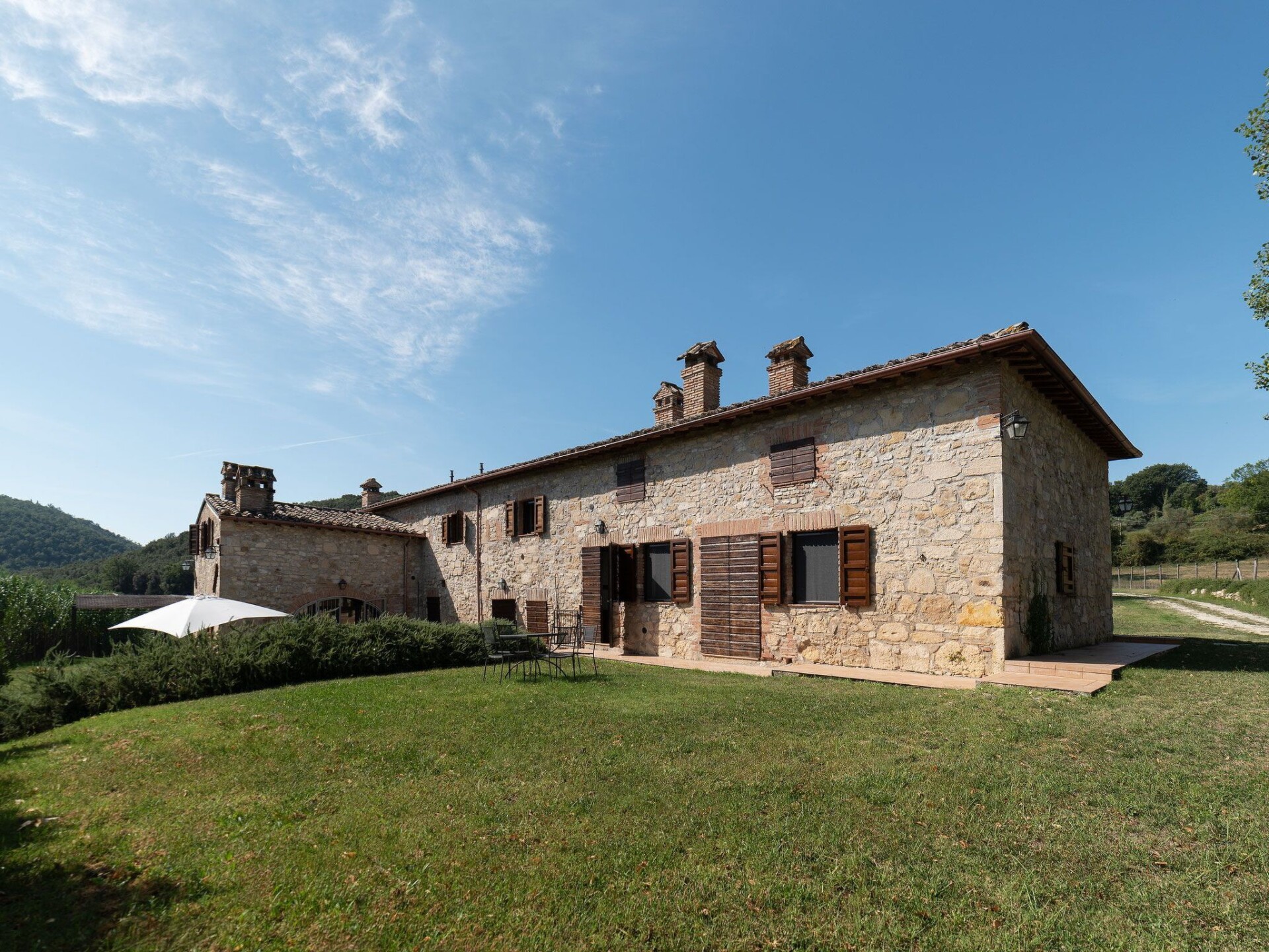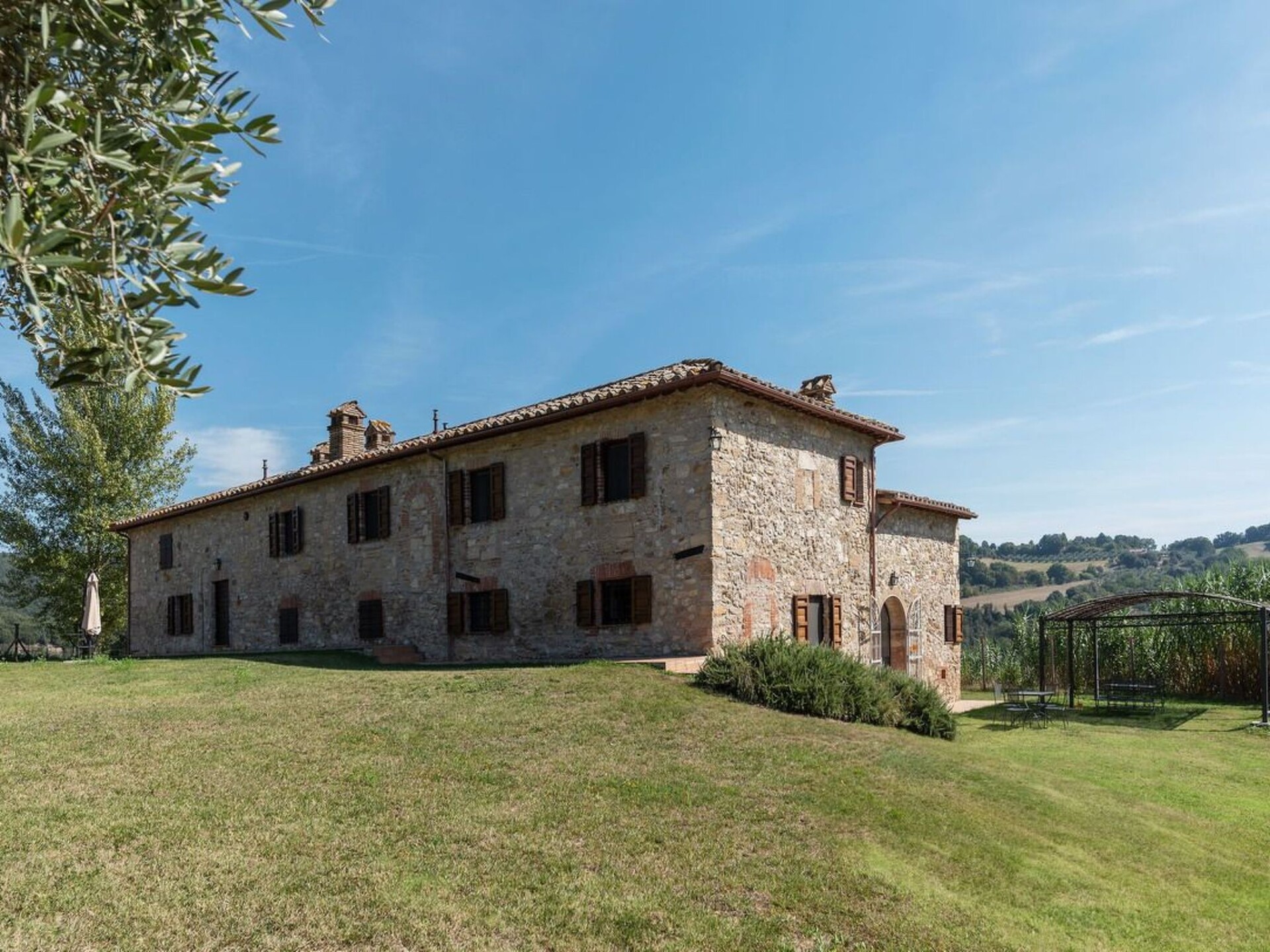 This truly unique, house has been converted to a comfortable villa. Surrounded by olive trees, lavender flowers, rosmary and jasmine it has expensive and stunning views around over countryside to hills backdrop. The swimming pool has been placed so that guest relaxing may enjoy these from their sunbeds. and the pergola in wrought iron is ideal for “dining al fresco.” Villa Ginevra is a charming and comfortable villa and it has been completely refurbished while retaining the original style with typical stone walls, cotta ceiling and wooden beams. The house is composed of 4 apartments (4+4+4+4+ 2 sofa beds) with independent entrances but it is rented as private villa for 4 families and couples or group of friends. Villa Ginevra villa offers guests a chance to escape and relax in a really secluded environment. But if guests can bear to leave their lost valley Viterbo, Todi, Narni,Orvietoare all no more than 50 kilometres away for some inspiring day trips. The center of Roma is easily reachable in 45 minutes by train from Orte which is only 15 km. Around the property there are several naturalistic trails among the forest where it is possible to make trekking, jogging and mountain biking On request the owner organizes cooking class. Pool is open from 17 of May till 20 of September.Private swimming pool (10 x 5) with showerOutside eating area with pergola and barbecueGround floor1 Big dining room/Kitchen with 4 stoves, oven, dishwasher and fridge1 Toilet1 Living/Kitchen with fireplace, sofa bed for two people wifi, 4 stoves, dishwasher, oven, fridge and kettle1 Living/Kitchen with fireplace, wifi, 4 stoves, dishwasher, oven, fridge and kettle4 Double bedded rooms (two for each apartment) 1 Shower room for disable and washing machine2 Shower rooms (one of them with washing machine)First floor1 Living/Kitchens with fireplace, sofa bed for two people wifi, 4 stoves, oven, fridge and kettle1 Living/Kitchens with fireplace, wifi, 4 stoves, oven, fridge and kettle4 Double bedded rooms (two for each apartment)2 Shower rooms with washing machineAmelia (supermarket and restaurants) 3 KmMontenero (restaurant) 2 KmOrte (train to Rom) 15 KmNarni 14 KMTodi 36 KmViterbo 44 KmOrvieto 47 KmTerni (Le Marmore waterfalls) 25 KmSpoleto 53 KmTarquinia (beaches) 84 KmBolsena (Lake) 70 KmRoma 93 KmPerugia (95 Km). IT055004B501014428