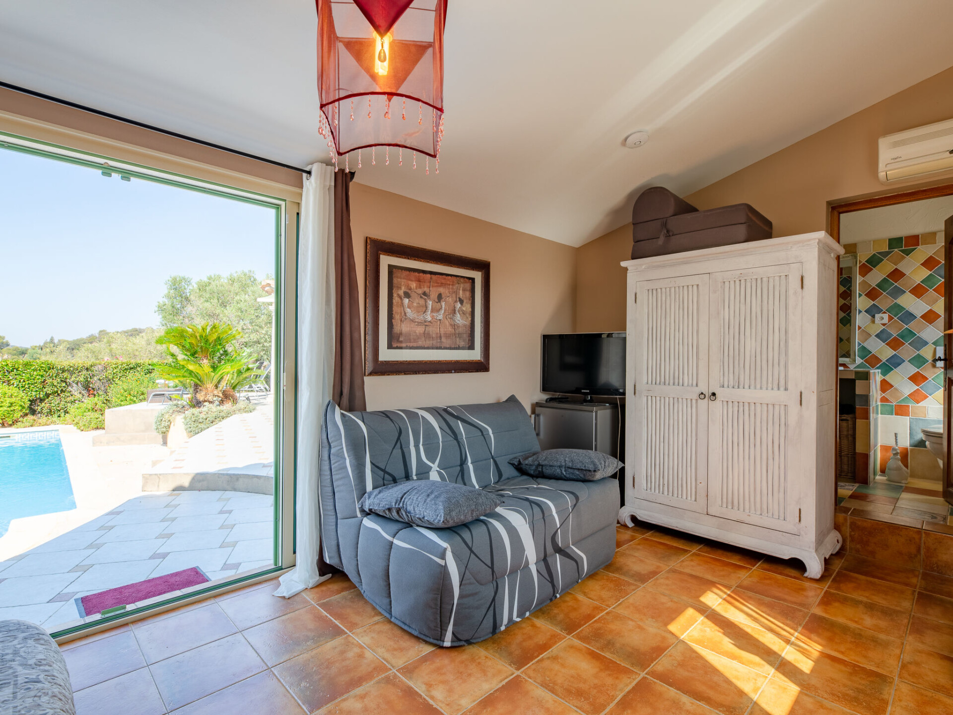 "Reves de Rives", huis 5-kamers 150 m2 op 2 verdiepingen. Licht, smaakvol ingericht: woon-/eetkamer met open haard (alleen decoratie), eettafel, Sat-TV, internationale TV-zenders en stereo-installatie. Uitgang naar het terras. 1 kamer met 1 2-pers bed (160 cm, lengte 190 cm), bad en air-conditioning. Studio met 1 2-pers bed (160 cm, lengte 200 cm), douche/WC en air-conditioning. Uitgang naar het terras. Keuken (5-pits kookplaat, oven, afwasmachine, broodrooster, waterkoker, magnetron, diepvriezer, elektrische koffiemachine). Uitgang naar de tuin. Aparte WC. Bovenverdieping: 1 kamer met 1 2-pers bed (160 cm, lengte 200 cm), air-conditioning. Uitgang naar het balkon. 1 kamer met 2 bedden (90 cm, lengte 200 cm), air-conditioning. Uitgang naar het balkon. Douche, aparte WC. Elektrische verwarming. Terras. Terrasmeubelen, elektrische barbecue, ligstoelen. Uitzicht op zee. Ter beschikking: wasmachine, droger, kluis. Internet (WiFi, gratis). Eén tweepersoonskamer is buiten het appartement. Aanbod door een particulier volgens art. 155, IV van CGI.