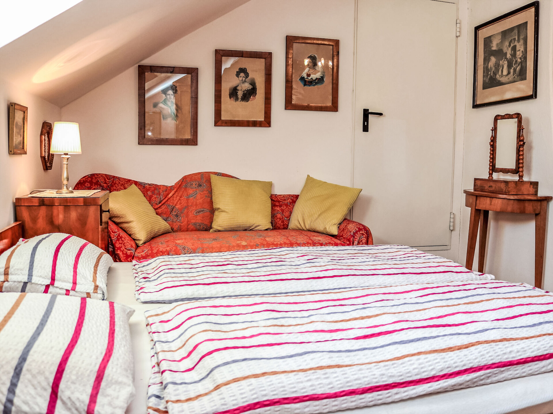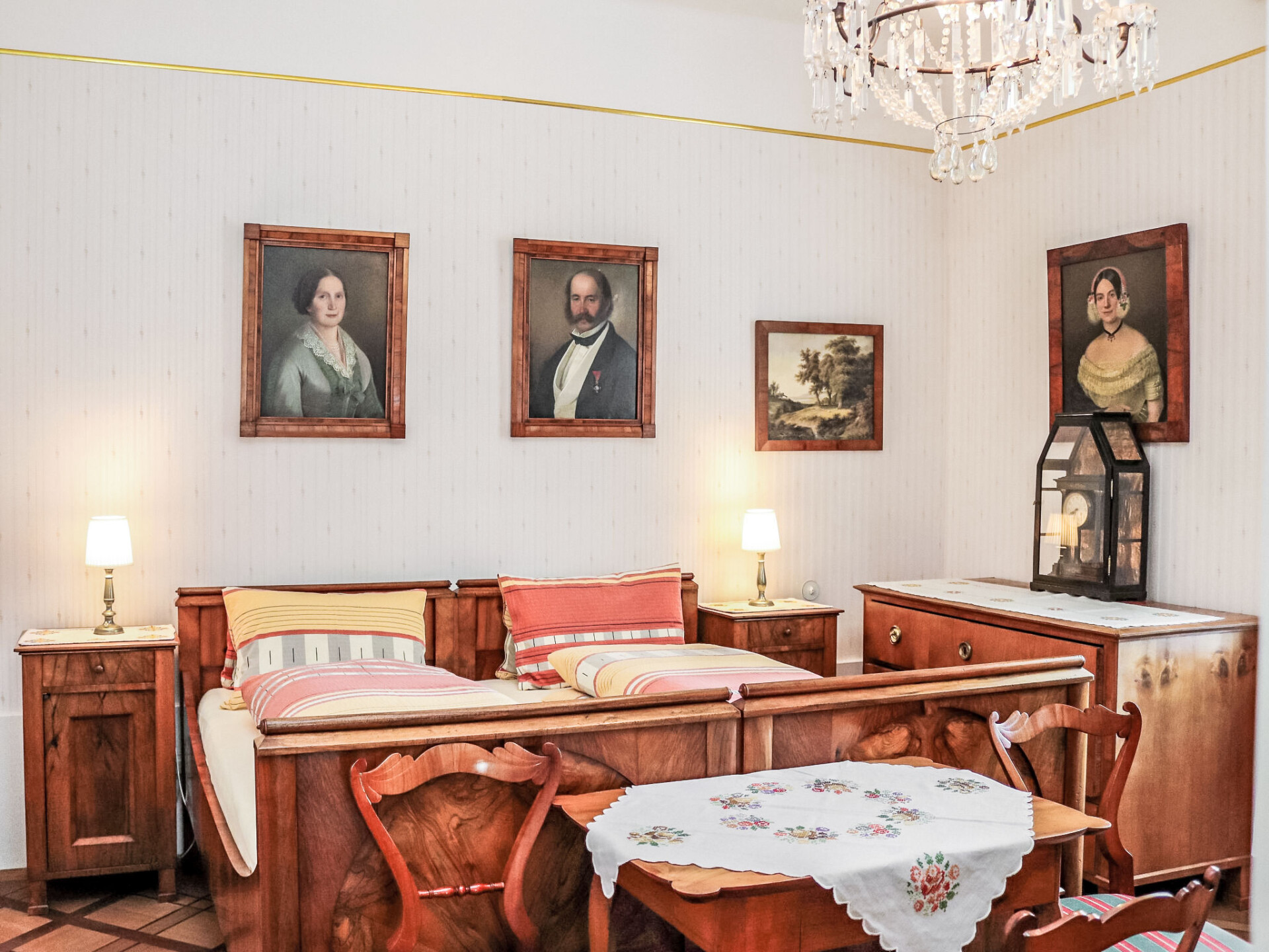 Villa 3-kamers 90 m2 op 2 verdiepingen. Zeer smaakvol en stijlvol ingericht: hal. Woonkamer met tegelkachel. 1 2-pers. kamer met douche/WC. Keuken (4-pits kookplaat, oven, afwasmachine, magnetron) met eethoek. Aparte WC. Bovenverdieping: 1 2-pers. kamer met Kabel-TV. Douche/WC. Vloerverwarming. Terras overdekt. Terrasmeubelen, bergruimte. Mooi uitzicht op de tuin. Ter beschikking: wasmachine. Internet (Internet (WiFi), gratis). Parkeerplaats (overdekt, 2 Auto's) bij het huis. Rookvrij huis. Het meubilair van de Rosenvilla is origineel Biedermeier. Er staat een grote piano in de salon. De afgebeelde tegelkachel dient alleen als een ornament. Vanwege de waardevolle uitrusting zijn kinderen alleen welkom vanaf 10 jaar. Bij reserveringen van meer dan 8 nachten is een tussentijdse schoonmaak verplicht en kost 60 EUR per schoonmaak ter plaatse. Als er minder dan het maximale aantal gasten in de accommodatie verblijft, zijn niet alle wooneenheden beschikbaar voor gebruik.