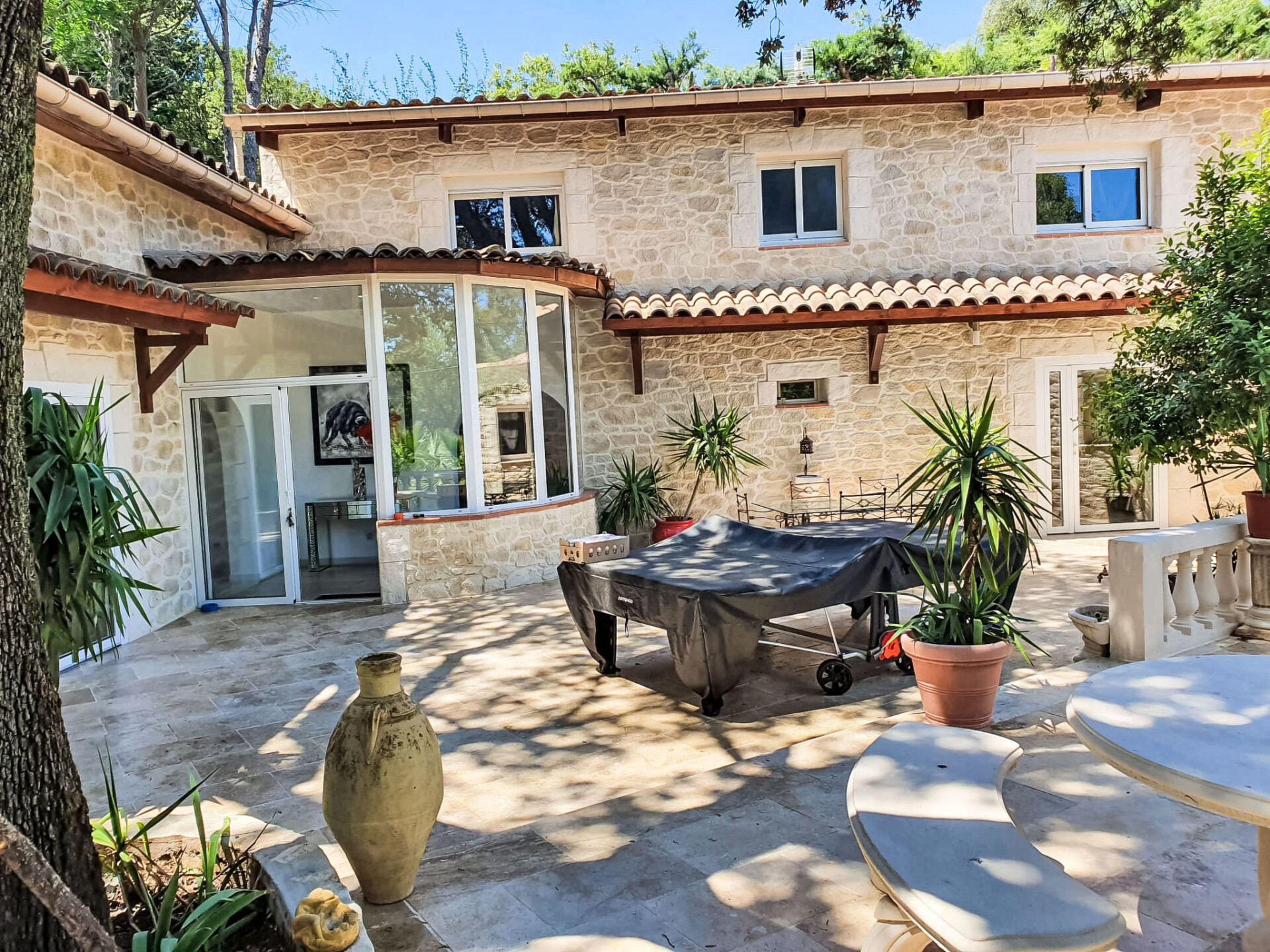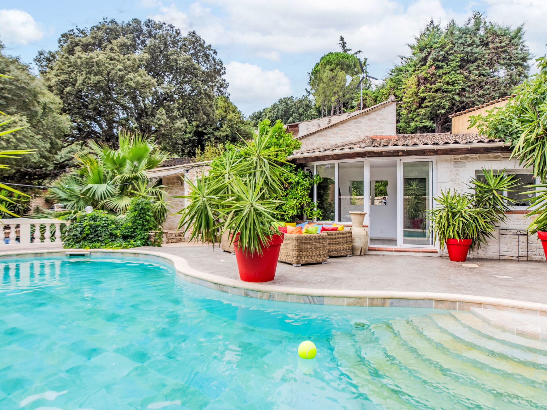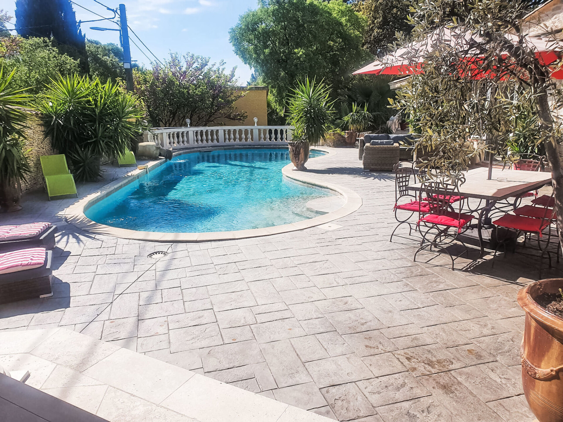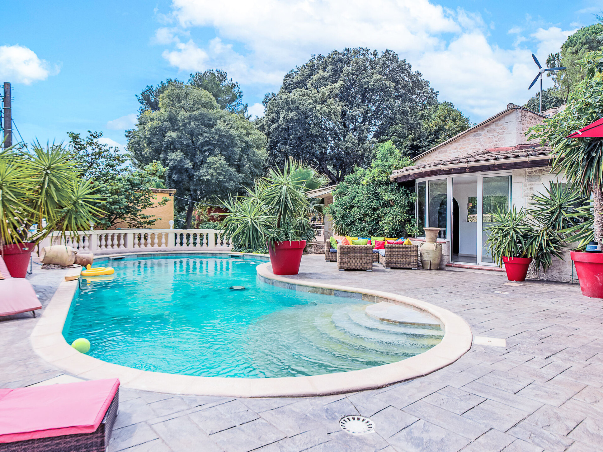 Nîmes: Zeer moderne, mooi villa "Villa du Soleil". In de plaats, 4 km van het centrum, rustige ligging in een woonwijk, 1 km van de bosrand, 54 km van zee, 850 m van de rivier, te midden van groen, op het zuiden. Voor alleengebruik: verzorgde tuin 600 m2 (omheind) planten en bloemen, openluchtzwembad niervormig, verwarmd, geen inkijk (15 x 5 m, 150 - 160 cm diepte, seizoensgebonden beschikbaarheid: 15.Mei. - 15.Okt.) met alarminstallatie. Poolhouse met koelkast, WC en fornuis, terras (60 m2), tuinmeubelen, barbecue, onderhoud zwembad door de eigenaar/tuinman. In het huis: tafeltennis. Broodjesservice, drankjesservice en ontbijt op verzoek (extra). Parkeerplaats (voor 4 auto's) op het terrein. Winkel 1.5 km, winkelcentrum 1.2 km, bakkerij 1.2 km, voetgangersgebied 4 km, bushalte "Gabriel Faure" 1 km, park "Square Agrippa d'Aubigné" 1.8 km. Jachthaven 34 km, tennis 1.4 km, manege 4.1 km, wandelroutes 2.2 km vanaf het huis, fietspad 3.5 km. Attracties in de buurt: Arènes de Nîmes 4.3 km, Pont du Gard 20 km, Jardins de la Fontaine 5 km, Maison Carrée de Nîmes 4.5 km, Camargue 18 km, Uzès 22 km. Bekende meren kunnen gemakkelijk worden bereikt: La Bouscarasse 31 km. De eigenaar accepteert geen jeugdgroepen. Laden en lossen van de baggage is mogelijk bij het huis. De omgeving is gevoelig voor geluidsoverlast. Gelieve geen lawaai te maken en de rust te bewaren.