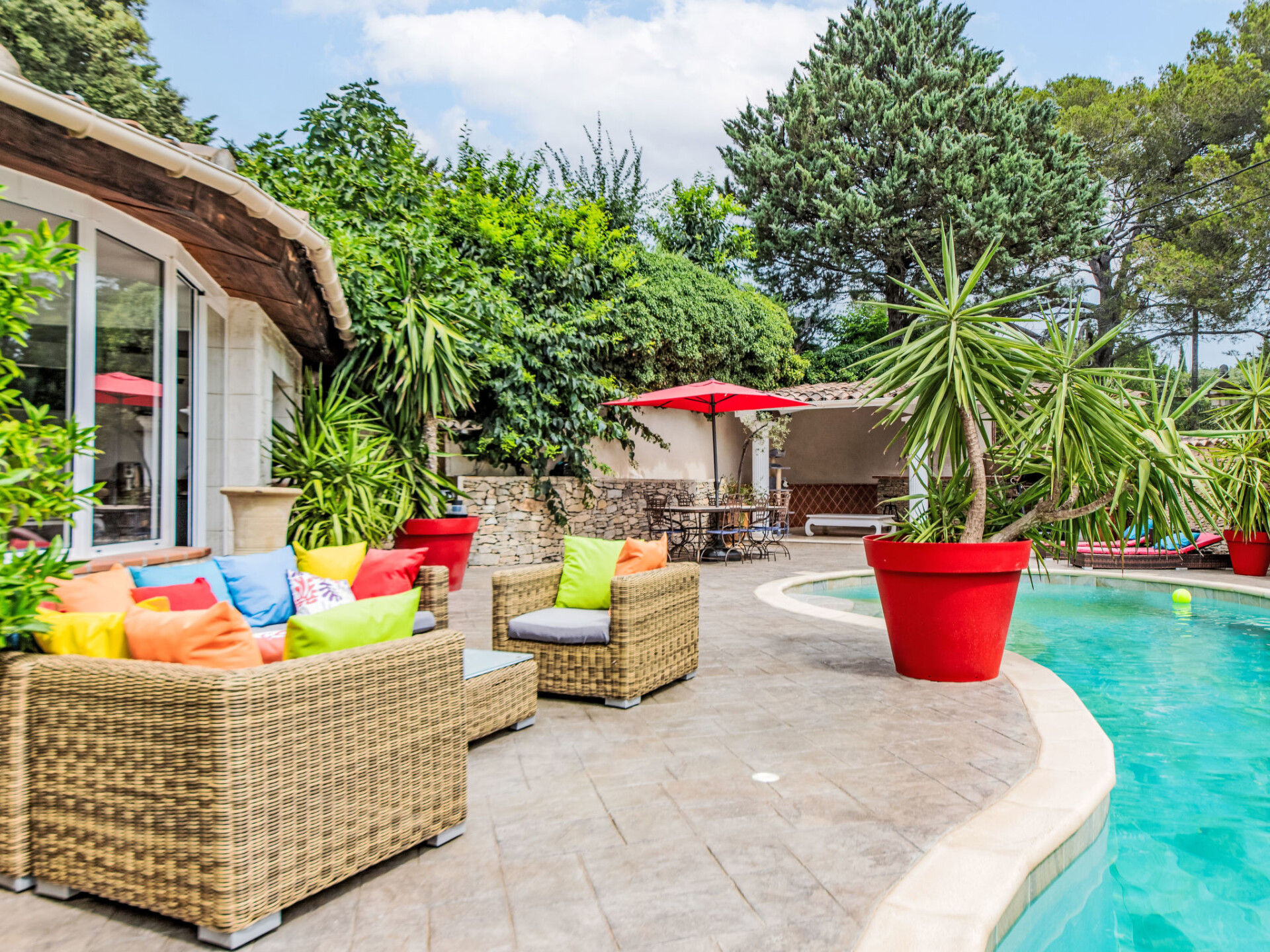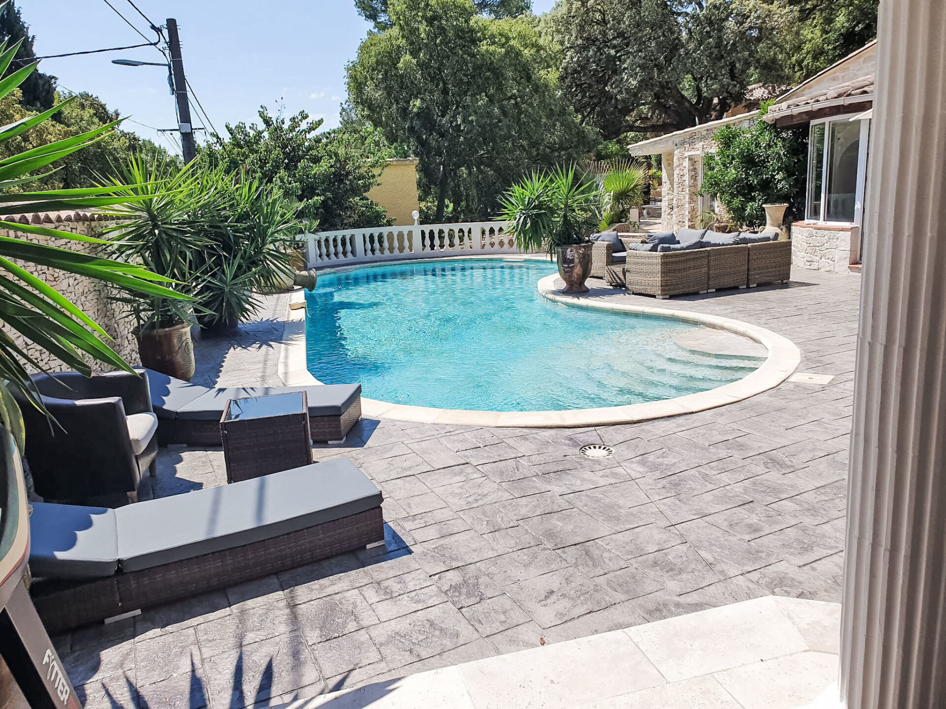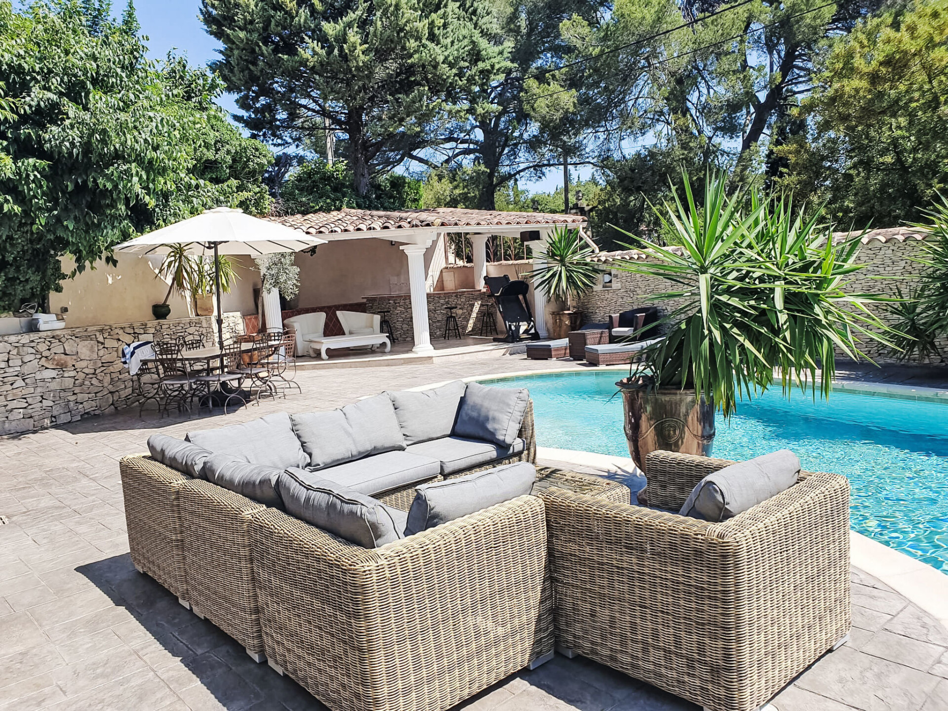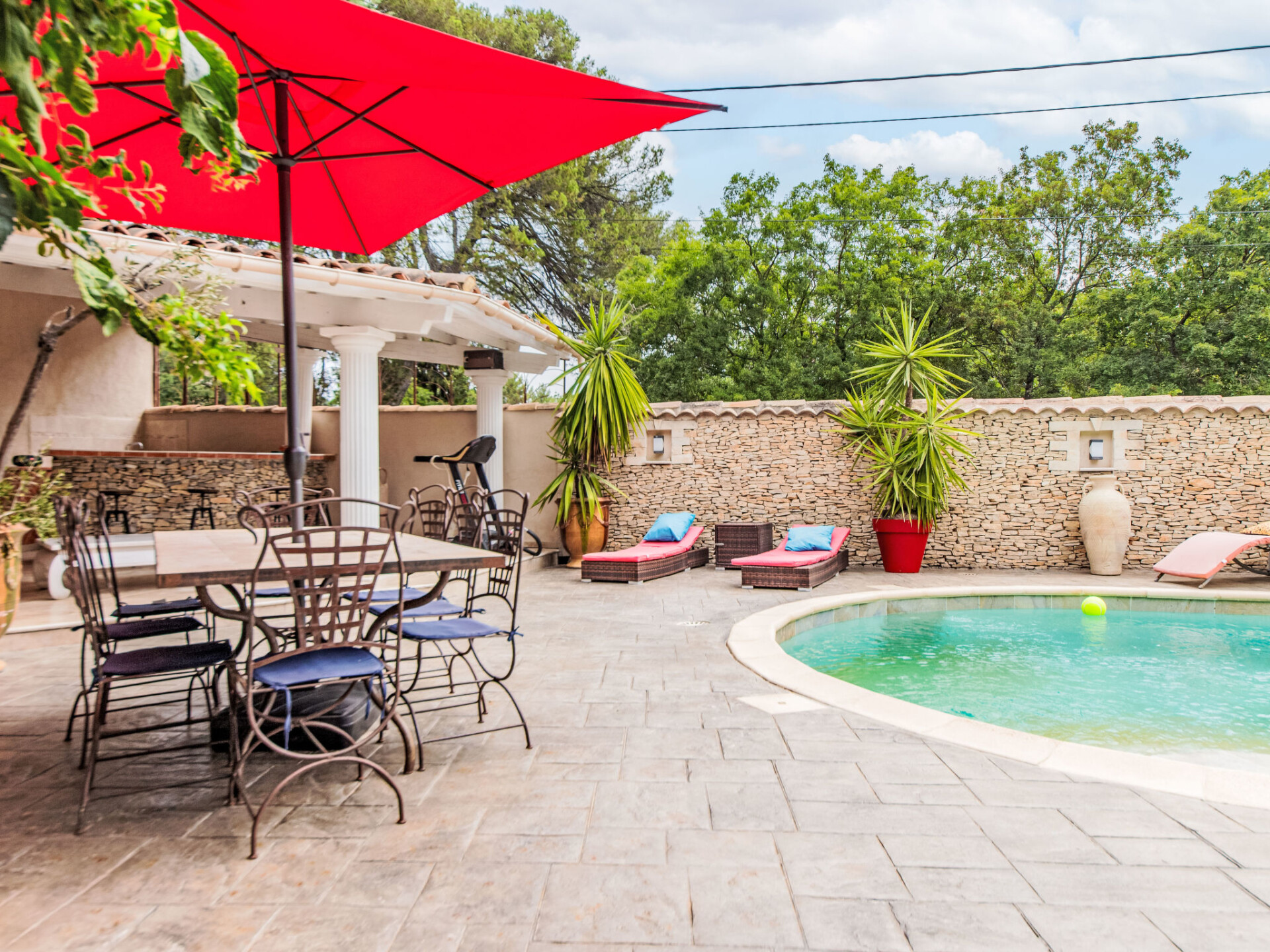 Nîmes: Zeer moderne, mooi villa "Villa du Soleil". In de plaats, 4 km van het centrum, rustige ligging in een woonwijk, 1 km van de bosrand, 54 km van zee, 850 m van de rivier, te midden van groen, op het zuiden. Voor alleengebruik: verzorgde tuin 600 m2 (omheind) planten en bloemen, openluchtzwembad niervormig, verwarmd, geen inkijk (15 x 5 m, 150 - 160 cm diepte, seizoensgebonden beschikbaarheid: 15.Mei. - 15.Okt.) met alarminstallatie. Poolhouse met koelkast, WC en fornuis, terras (60 m2), tuinmeubelen, barbecue, onderhoud zwembad door de eigenaar/tuinman. In het huis: tafeltennis. Broodjesservice, drankjesservice en ontbijt op verzoek (extra). Parkeerplaats (voor 4 auto's) op het terrein. Winkel 1.5 km, winkelcentrum 1.2 km, bakkerij 1.2 km, voetgangersgebied 4 km, bushalte "Gabriel Faure" 1 km, park "Square Agrippa d'Aubigné" 1.8 km. Jachthaven 34 km, tennis 1.4 km, manege 4.1 km, wandelroutes 2.2 km vanaf het huis, fietspad 3.5 km. Attracties in de buurt: Arènes de Nîmes 4.3 km, Pont du Gard 20 km, Jardins de la Fontaine 5 km, Maison Carrée de Nîmes 4.5 km, Camargue 18 km, Uzès 22 km. Bekende meren kunnen gemakkelijk worden bereikt: La Bouscarasse 31 km. De eigenaar accepteert geen jeugdgroepen. Laden en lossen van de baggage is mogelijk bij het huis. De omgeving is gevoelig voor geluidsoverlast. Gelieve geen lawaai te maken en de rust te bewaren.