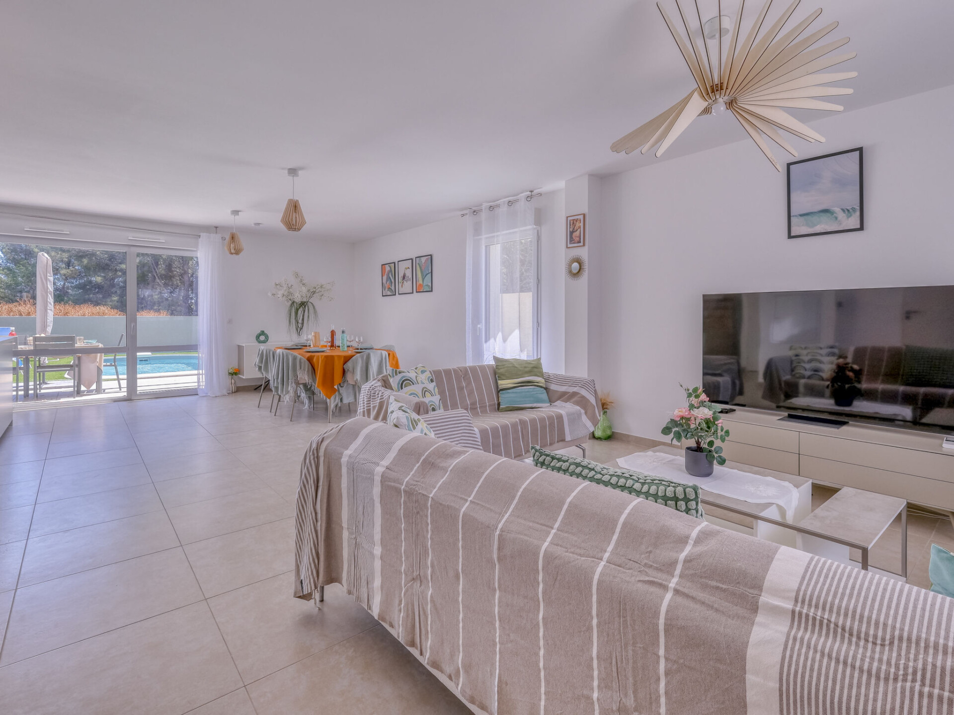 Huis in een rij 4-kamers 120 m2 op 2 verdiepingen. Ruim en licht, comfortabel en modern ingericht: groot woon-/eetkamer 35 m2 met eettafel en TV (Flatscreen TV). Uitgang naar de tuin, naar het terras. Open keuken (oven, afwasmachine, 4 inductiekookplaten, magnetron, diepvriezer, elektrische koffiemachine, pads voor de koffiemachine (Vertuo + filtre) extra) met bar. Uitgang naar het terras. Douche/bidet/WC. Air-conditioning, heteluchtverwarming. Bovenverdieping: 1 kamer met 1 2-pers bed (160 cm, lengte 200 cm), douche en air-conditioning. 1 kamer met 1 2-pers bed (160 cm, lengte 200 cm), air-conditioning. 1 kamer met 2 bedden (90 cm, lengte 190 cm), air-conditioning. Douche, aparte WC. Air-conditioning, heteluchtverwarming. Terras 20 m2, groot terras 60 m2. Ter beschikking: wasmachine, strijkijzer. Internet (WiFi, gratis). Parkeerplaats (2 Auto's). Rookvrij huis. TV alleen FR. Rookmelders. Aanbod door een particulier volgens art. 155, IV van CGI. 13028002495H4