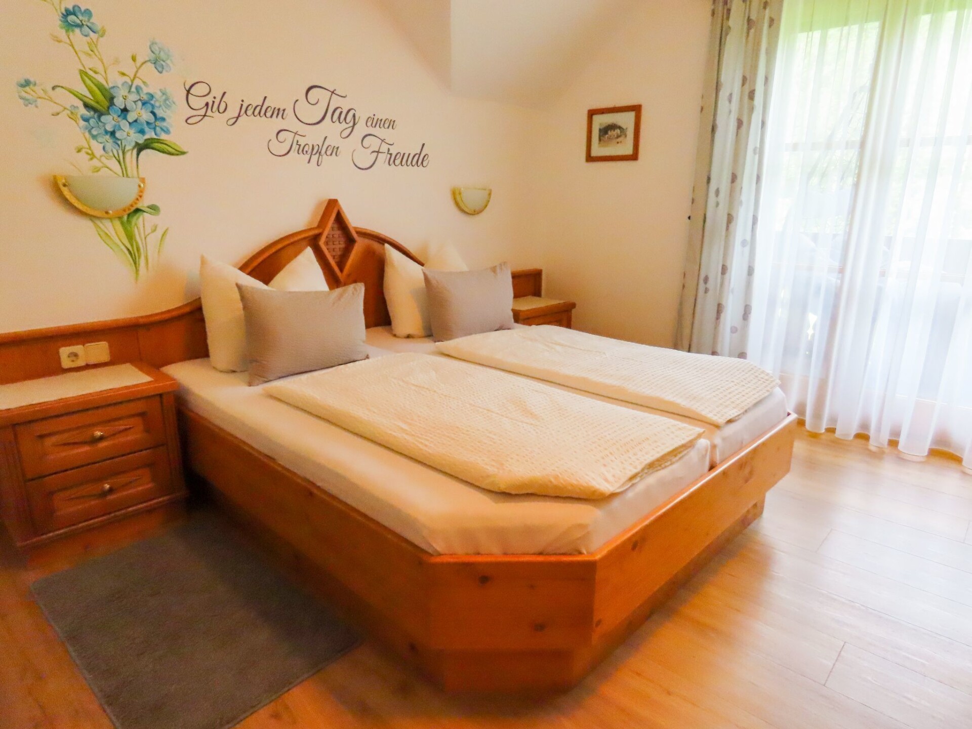 Welcome to our cosy holiday flat in Steinfeld, Carinthia, which is perfect for up to 4 people. This farmhouse-style flat with solid wood furniture is located on the second floor and promises a relaxing stay surrounded by nature. With two bedrooms, which can be darkened for peace and privacy, and two bathrooms with shower, it offers enough comfort for a family or small group.The flat has both a terrace and two balconies with hanging chairs for relaxing outdoors. The property's garden is available for communal use and offers a harmonious retreat with its hanging lounger and deckchairs. Situated right on the edge of the forest, this is the ideal starting point for nature lovers and explorers of the surrounding area.For your convenience, a washing machine and tumble dryer are available in the building. We are happy to wash and dry your laundry for a fee depending on the effort and quantity. The flat is powered by renewable energy and solar energy, which makes your stay environmentally friendly.The surrounding area offers a wealth of activities. The Greifenburg bathing lake is just 3.5 km away. A children's paradise, ideal for water sports or simply enjoying the idyllic landscape. The nearest village centre, also 3.5 km away, is inviting with grocery shops and local amenities.As pets are not allowed in this holiday flat, you can look forward to an undisturbed and clean environment. The owner of the property lives on the premises, which promises a personal touch and assistance if needed.Discover the charm of our surroundings and enjoy your stay in this inviting holiday flat and make yourself at home.