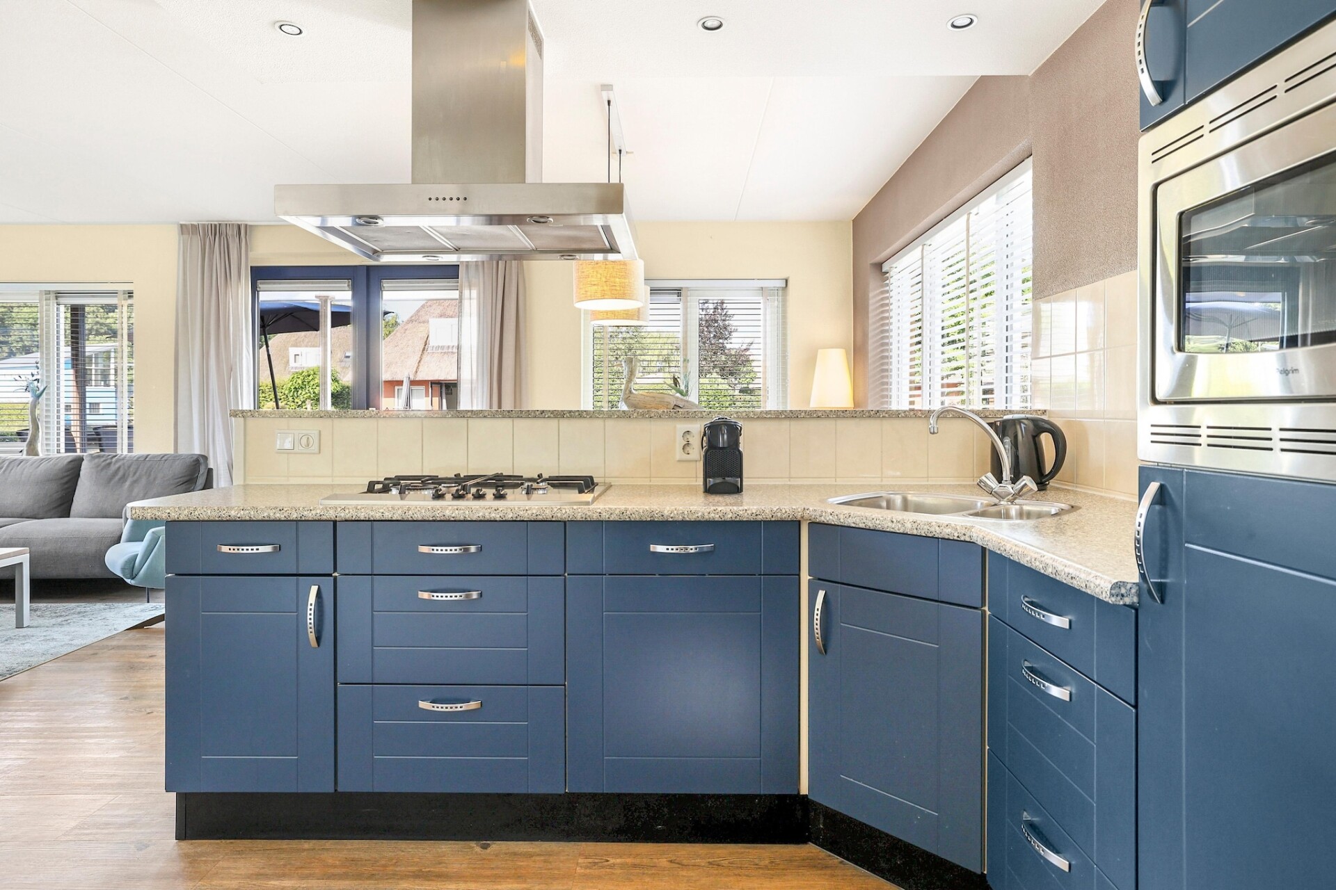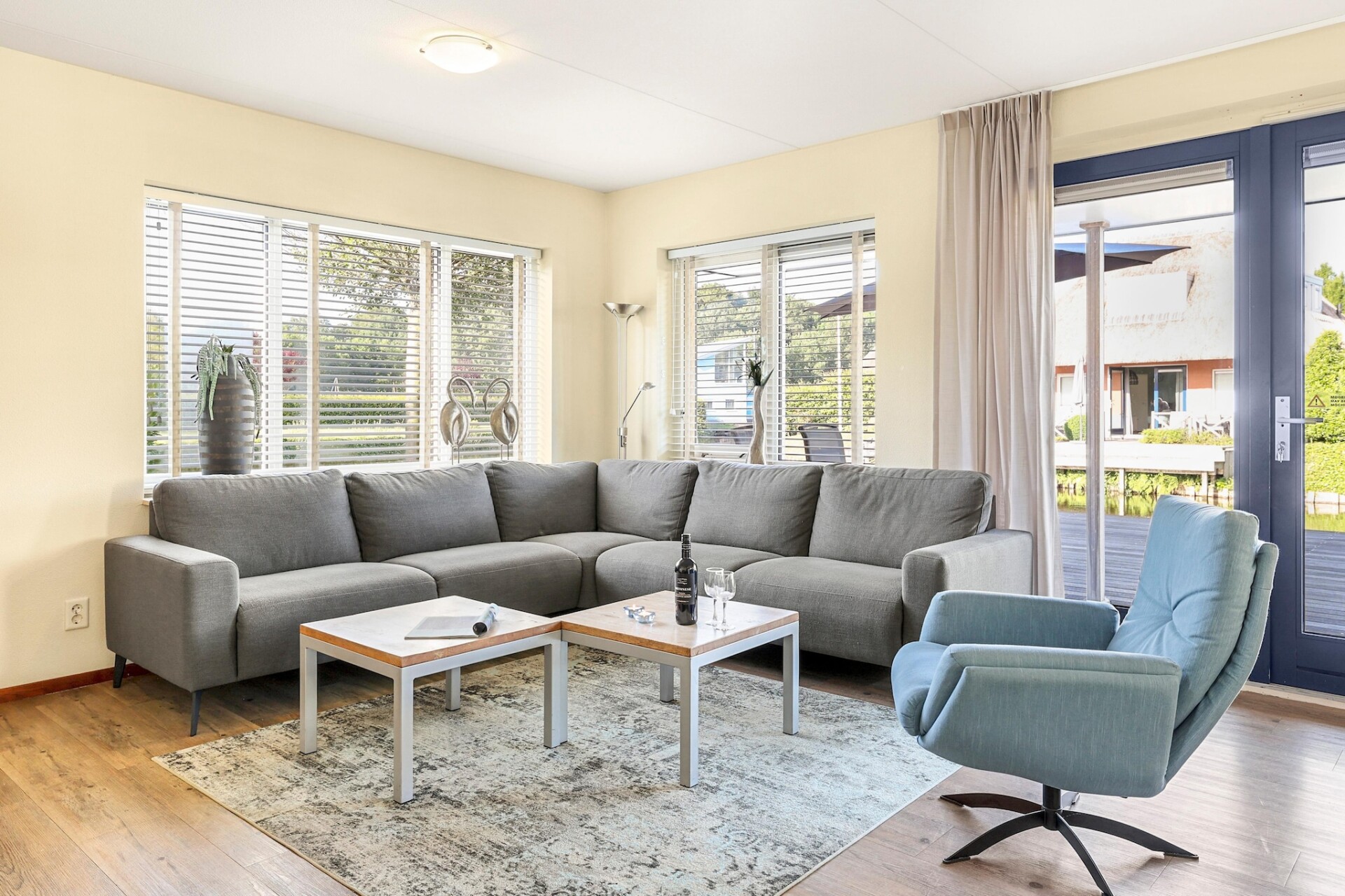 Het vakantiehuis staat op het waterrijke deel van het vakantiepark, is comfortabel en compleet ingericht en beslaat twee etages. Op de begane grond is er een woonkamer met TV en een open keuken met onder andere een combimagnetron en afwasmachine. De badkamer beschikt over een ligbad of douche. In de hal is er een apart toilet. Een berging met wasmachine en -droger maakt het geheel compleet. Op de eerste etage vindt u er drie slaapkamers, waarvan twee met elk twee 1-pers. boxspringbedden. In één slaapkamer staan de bedden in een 2-pers. opstelling. In de derde slaapkamer staat een stapelbed. Een kinderbed, -stoel en traphekje zijn standaard aanwezig. In het vakantiehuis zijn, naast de trap, enkele traptreden aanwezig.