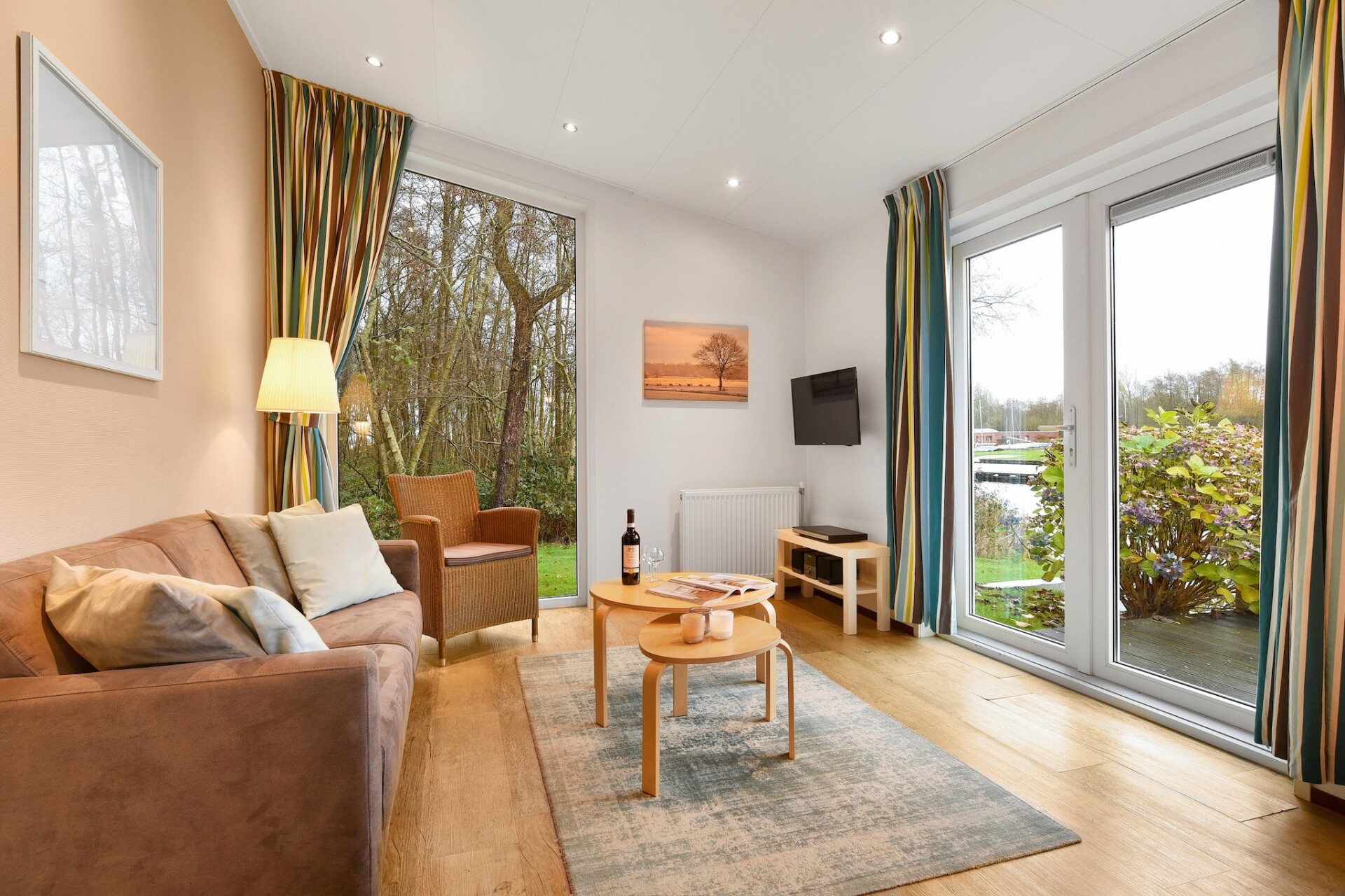 Het gelijkvloerse chalet staat op het waterrijke deel van het vakantiepark en is comfortabel en compleet ingericht. Er is een woonkamer met TV en een open keuken met onder andere combimagnetron en afwasmachine. Er zijn twee slaapkamers, elk met twee 1-pers. boxspringbedden, al dan niet in een 2-pers. opstelling. In één van de slaapkamers vindt u er een TV. De badkamer beschikt over een douche. In de hal is er een apart toilet. Een berging met wasmachine en -droger maakt het geheel compleet. Bij enkele chalets kunnen er traptreden in de woonkamer zijn.