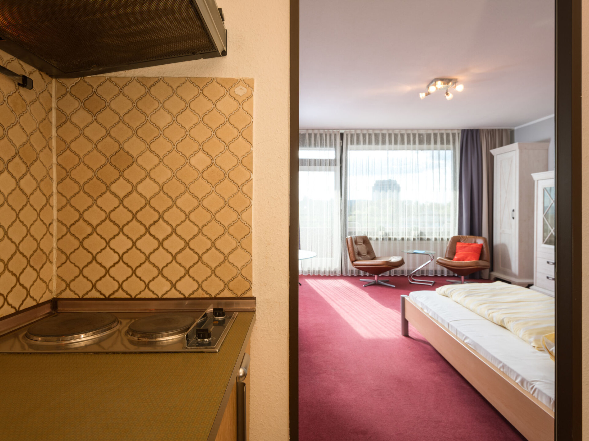 "Weitblick (B1010)", appartement 1-kamer 33 m2 op de 10e verdieping, op het westen gelegen. Woon-/slaapkamer met 2 bedden (90 cm, lengte 200 cm), Sat-TV. Uitgang naar het balkon. Kookhoek in de hal (2-pits kookplaat, broodrooster, waterkoker, elektrische koffiemachine). Bad/douche/WC. Balkonmeubilair. Zeer mooi uitzicht op het landschap. Ter beschikking: Internet (WiFi, gratis). Niet rokers woning. Rookmelders.