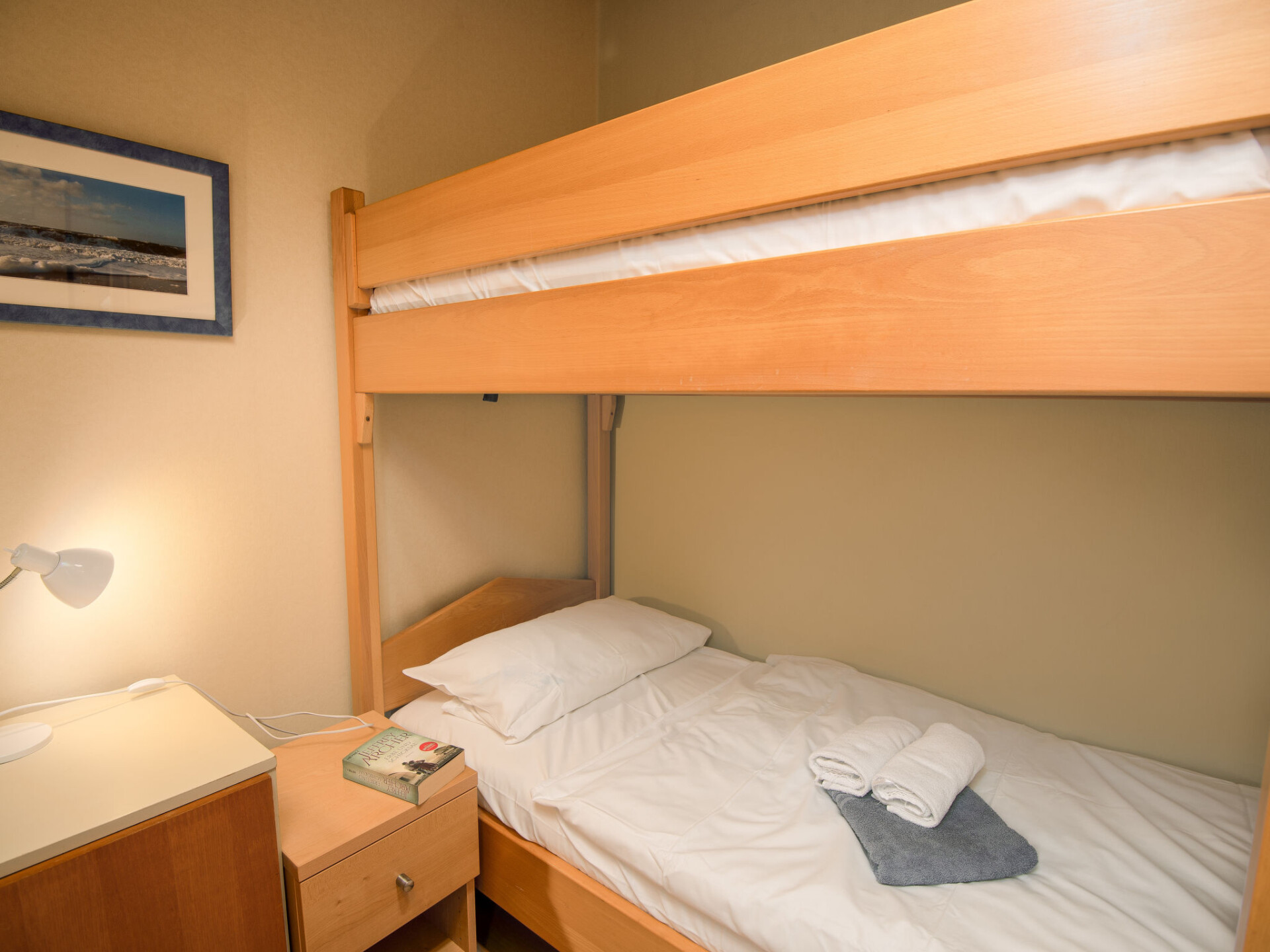 "Wind", huis in een rij 3-kamers 48 m2, op de begane grond. Ruim, gezellig ingericht: woon-/eetkamer 19 m2 met Sat-TV (Flatscreen TV), stereo-installatie. 1 kamer 9 m2 met 1 2-pers bed (2 x 80 cm, lengte 200 cm). 1 kamer 4 m2 met 1 x 2 stapelbedden (80 cm, lengte 200 cm). Keuken (afwasmachine, 4 keramische glas kookplaten, broodrooster, waterkoker, magnetron, elektrische koffiemachine). Douche/WC. Terras 20 m2. Terrasmeubelen. Ter beschikking: kinderstoel (extra). Internet (Internet (WiFi), gratis). Rookvrij huis. Rookmelders.