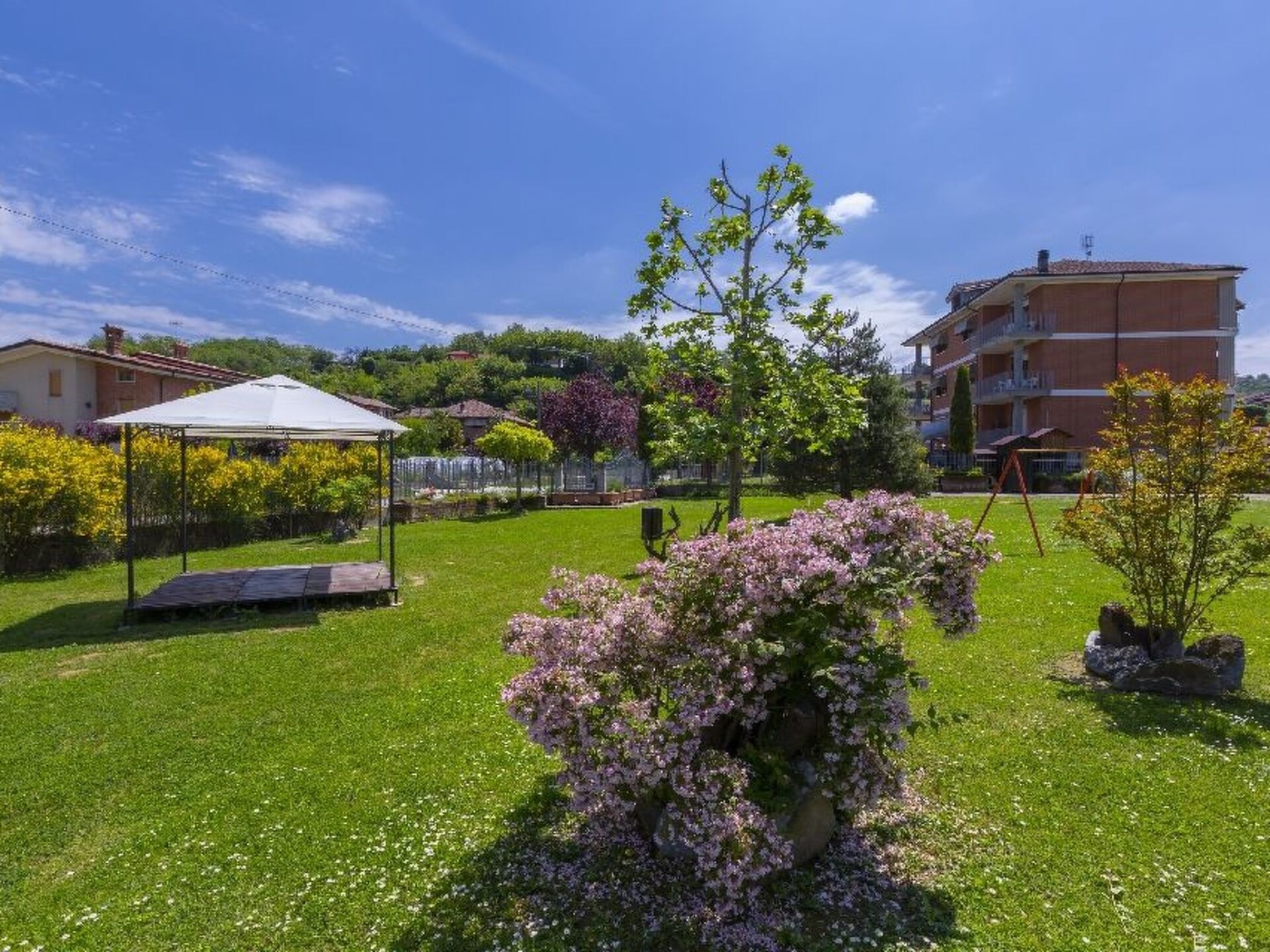 The Residence offers the possibility of spending unforgettable holidays or quiet weekends in total relaxation, alternating it with the incomparable experiences that the local gastronomy offers with a variety of flavours that change with the seasons.The property area includes the car park, in front of the residence, and a green area of approximately 3,000 m2, where we find the 14 x 6 m swimming pool, with sun loungers and parasols, a grass volleyball court, indoor table football, table tennis, as well as a second area adjacent to the swimming pool, with tables, chairs, a large gazebo and barbecue. The whole area is fenced off so that children can have fun safely and parents can relax in peace.The flat has an entrance hall, 2 double bedrooms, kitchenette, dining room, bathroom, terrace and balcony.It is equipped with everything necessary for normal living from the kitchen to the bathroom: tablecloths, cutlery, plates, glasses, pots, etc.There is parking space in the fenced yard. In the garden there is a swimming pool with solarium equipped with sun beds and umbrellas and 2 solar showers, gazebo and large umbrellas with chairs and tables, 2 barbecues, table tennis table, table football and volleyball area on the lawn. All this surrounded by trees and flowers. There is also a wallbox for charging electric cars. The flat has a large 10 m2 balcony, equipped with garden furniture and overlooking the hills and the beautiful village of Cisterna d'Asti, which dominates the valley.It is the ideal place to spend unforgettable holidays in the heart of the Roero or quiet weekends in total relaxation.Travelling in the Roero is an experience that leaves indelible sensations of orderly, unspoilt landscapes: from the rows of vines, which yield great wines, to the wooded areas rich in vegetation and wild animals that populate its stupendous fortresses.From September onwards, the environment is filled with the images of the 'trifolao' with their faithful dogs in search of the 'precious' truffle, which here finds the ideal terrain to best release its unmistakable and delicious perfume; up on the hillsides, hidden amidst colours that are unique in nature, from yellow ochre to fiery red to orange, the vine-dressers are intent on the delicate operations of harvesting, and everywhere it is a great celebration.In the centre of this beautiful setting, in Cisterna d'Asti, is the Nocente family's Residence 'Le Betulle'.By car, you can visit Alba, capital of the Langhe and world-famous for its truffles, which is only 15 km away, as well as Asti, the medieval and Palio city, 16 km away. Turin is 48 km away.For those who would also like to spend a day at the seaside, the coast of Liguria (pictured is one of the beaches at Bergeggi, 8 km from Savona) is 145 km away, 120 km of which are on the motorway. For the more energetic, it is also possible to visit the beautiful scenery of the Alps: Sestriere (photo), for example, is 125 km away. For those who don't give up shopping even on holiday, we recommend the highly visited Designer Outlet in Serravalle Scrivia, 90 km away. IT005040B4PKQRBD9T