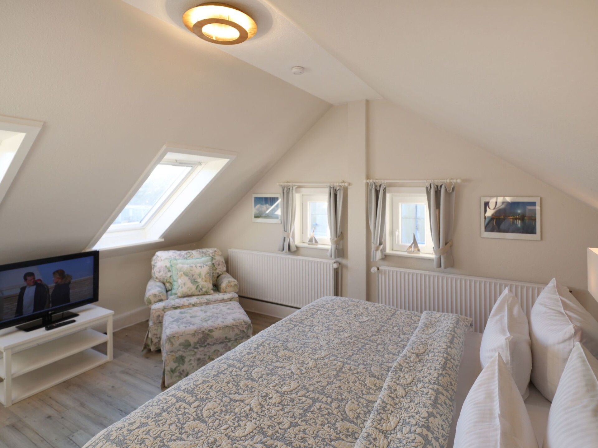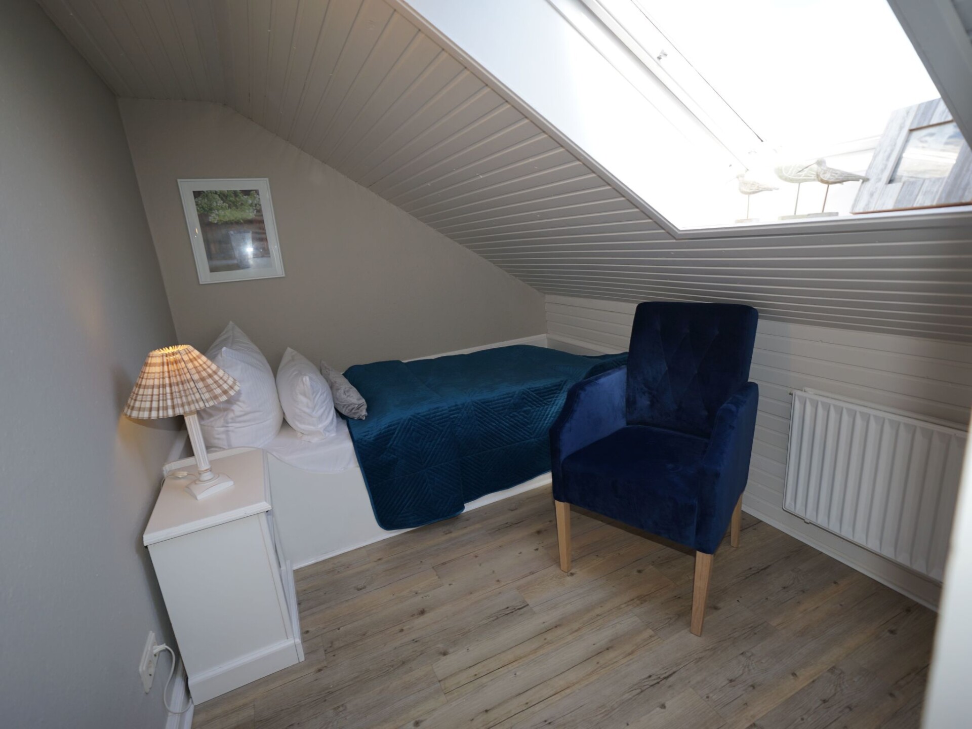 You can't live much closer to the beach! All 6 flats in the Strandhaus are maisonettes, furnished in a Mediterranean style and generously proportioned. The beach crossing Käpt'n-Christiansen-Str. is 190 metres away, Friedrichstraße approx. 400 metres. A short walk leads to Westerland's promenade, which is 4 kilometres long and meets all requirements in terms of gastronomy and shopping.We warmly welcome you to our 4-room holiday flat Strand-Loft in the newly opened "Strandvilla Schützenstraße 4" in Westerland. The generously designed flat with approx. 86 square metres extends over 2 levels (1st floor and attic), the maxim here is "Arrive and feel good": the spacious 4-room upper floor flat offers space for up to 5 people. From the hallway area, the staircase leads up to the large master bedroom with flat screen TV as well as the shower room and the two single bedrooms with connecting doors. The kitchen is equipped with a dining area, microwave oven, dishwasher and 2-burner ceramic hob. From here you enter the bright living room with sofa, stressless relax armchair and large flat screen TV with DVD player. A table and chairs await you on the sunny south-facing balcony and the large bedroom offers you a cosy double bed for dreaming. Two single bedrooms on the first floor invite you to relax. In the basement of the house there is a washing machine and tumble dryer, an ironing board and iron as well as a sauna (for a fee), which can be used communally. Free Wifi is of course available throughout the house, and there are plenty of opportunities to relax and enjoy each other's company, whether on soft cushions, at the large dining table or on the balcony. Come with high expectations, they will be fulfilled here!