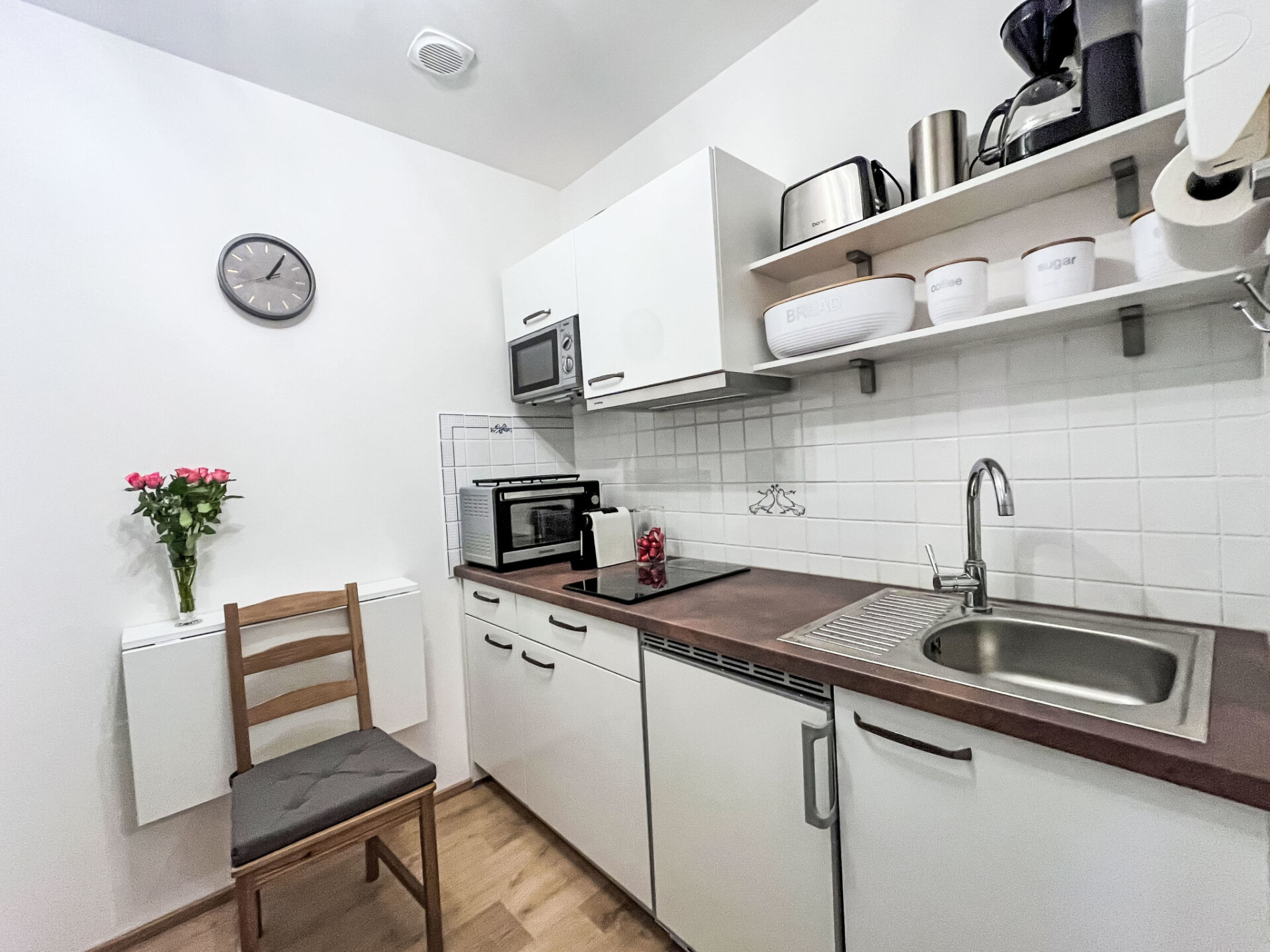 "Wolf", appartement 1-kamer 33 m2, op verhoogde begane grond. Het objekt is geschikt voor 2 volwassenen + 1 kinderen. Gerenoveerd in 2024: woon-/slaapkamer met 1 divanbed, 1 2-pers bed, eettafel, Sat-TV en internationale TV-zenders (Flatscreen TV). Uitgang naar de loggia. Kleine keuken (mini-oven, oven, 2 keramische glas kookplaten, broodrooster, waterkoker, magnetron, elektrische koffiemachine, pads voor de koffiemachine (Nespresso) extra). Douche/WC. Verwarming. Parketvloeren. Balkon. Balkonmeubilair. Ter beschikking: Internet (Internet (WiFi), gratis). Niet rokers woning.