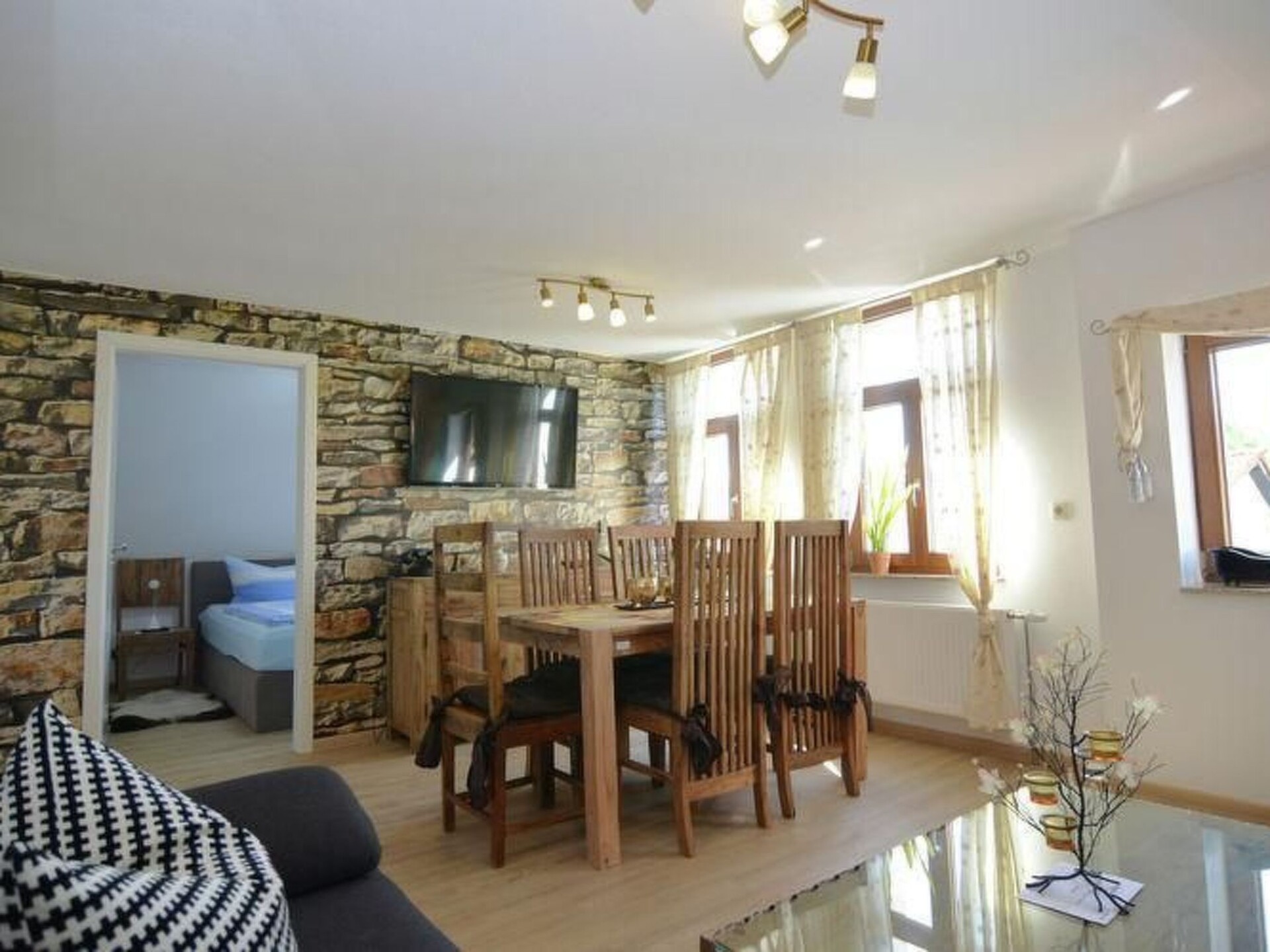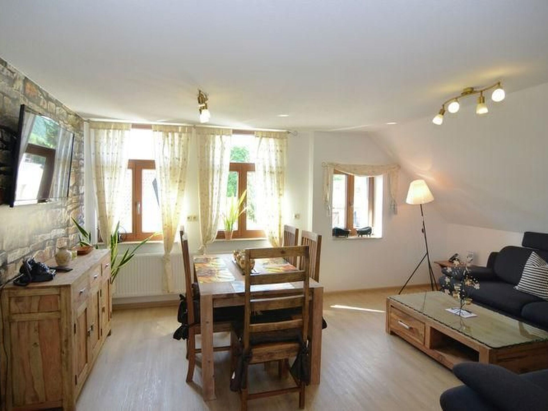 Completely newly renovated luxurious holiday home for a maximum of 12 people centrally located in Thale 10 minutes from the Bodetal and cable car. On the 1st floor there is a living room with a modern integrated kitchen, dishwasher and a large 46" LED TV, two bedrooms with new large box spring beds and an additional 32" LED TV each and a beautiful bathroom with shower & WC. The 2nd floor surprises you with a huge corner sofa and a 46 "LED TV on a stone wall in the living room with a view from the window to the Hexentanzplatz & the Roßtrappe. A modern kitchen with everything you need including a dishwasher. Furthermore, there are two bedrooms, each with a large box spring bed & additional 32 "LED TV, the new bathroom has a large shower and a toilet. W-LAN can be used free of charge throughout the house and the property has a large cosy inner courtyard with a covered seating area, modern seating furniture and invites you to barbecue. Free parking is available in front of the house and all sights, restaurants and shopping facilities in Thale are within easy walking distance. pets are welcome on request.Short descriptionOther : Non smoking houseShort description 1Number of kitchens : 2Living room 1Other living room facilities : modern furnishings, large 46" LED TV, large dining table, separate sitting area, telephoneBedroom 1Other bedroom furnishings : new large box-spring bed with LED TVBedroom 2Other bedroom furnishings : new large box-spring bed with LED TVBedroom 3Other bedroom furnishings : new large box-spring bed with LED TVBedroom 4Other bedroom furnishings : new large box-spring bed with LED TVLiving room 2Other living room furnishings : large seating element, huge dining table, 46" LED TV, telephoneKitchen 1Other kitchen equipment : new great kitchen with all comforts such as dishwasher & ceramic hobKitchen 2Other kitchen equipment : new great kitchen with all comforts such as crockery player & ceramic hobSurroundingsSports facilities in the area : Mountaineering, Football ground, Golf course, Hunting, Canoeing, Climbing, Mountain biking, Cycling, Indoor riding arena, Horse riding, Tobogganing, Rowing, Cross-country skiing, Alpine skiing, Sports centre, TennisSurroundings 1Excursions: Take the new cable car to the Hexentanzplatz, the mountain theatre, the zoo, the upside-down witch's house and toboggan down the bobsleigh run, the Ketterwald, Fanpark & relax in the Bodetal. Ride the Brockenbahn railway or take part in a hike and at the end of the day relax in the beautiful Bodetaltherme thermal baths, not far away are the stalactite caves in Rübeland, the western town in Hasselfelde and be sure to visit the towns of Quedlinburg & Wernigerode. for people looking for a kick, Harzdrenalin near Wendefurt is the right place.The largest suspension bridge in the world is to be built in 10/2016! Your landlord will be happy to provide you with further information!Local description : A fabulous mountain world awaits you on the left of the Hexentanzplatz and on the right the Roßtrappe, the eventful Bodetal with fan park for young and old and not to forget the new Bodetaltherme for relaxing and unwinding. In summer you can enjoy the new water world in the open air and Thale has simply developed into a tourist stronghold in recent years. Ideal starting point for all activities & hikes in Thale and the surrounding area such as Quedlinburg & Wernigerode, the holiday home Wotan is so centrally located that everything is within walking distance.Other sports and leisure activities: Bauspielhaus, Bodetaltherme, climbing forest, fan park, Bodetal, mountain theatre, bobsleigh run, witches' dance floor, zoo, Roßtrappe, cable car, chairlift, Brocken and Harz narrow-gauge railway, western town Pullmancity in Hasselfelde, glassblowing in Derenburg, DDR museum, Rübelander stalactite cave, Harzdrenalin,Garden and outdoor facilitiesGarden equipment: garden furniture available, barbecue, play equipment