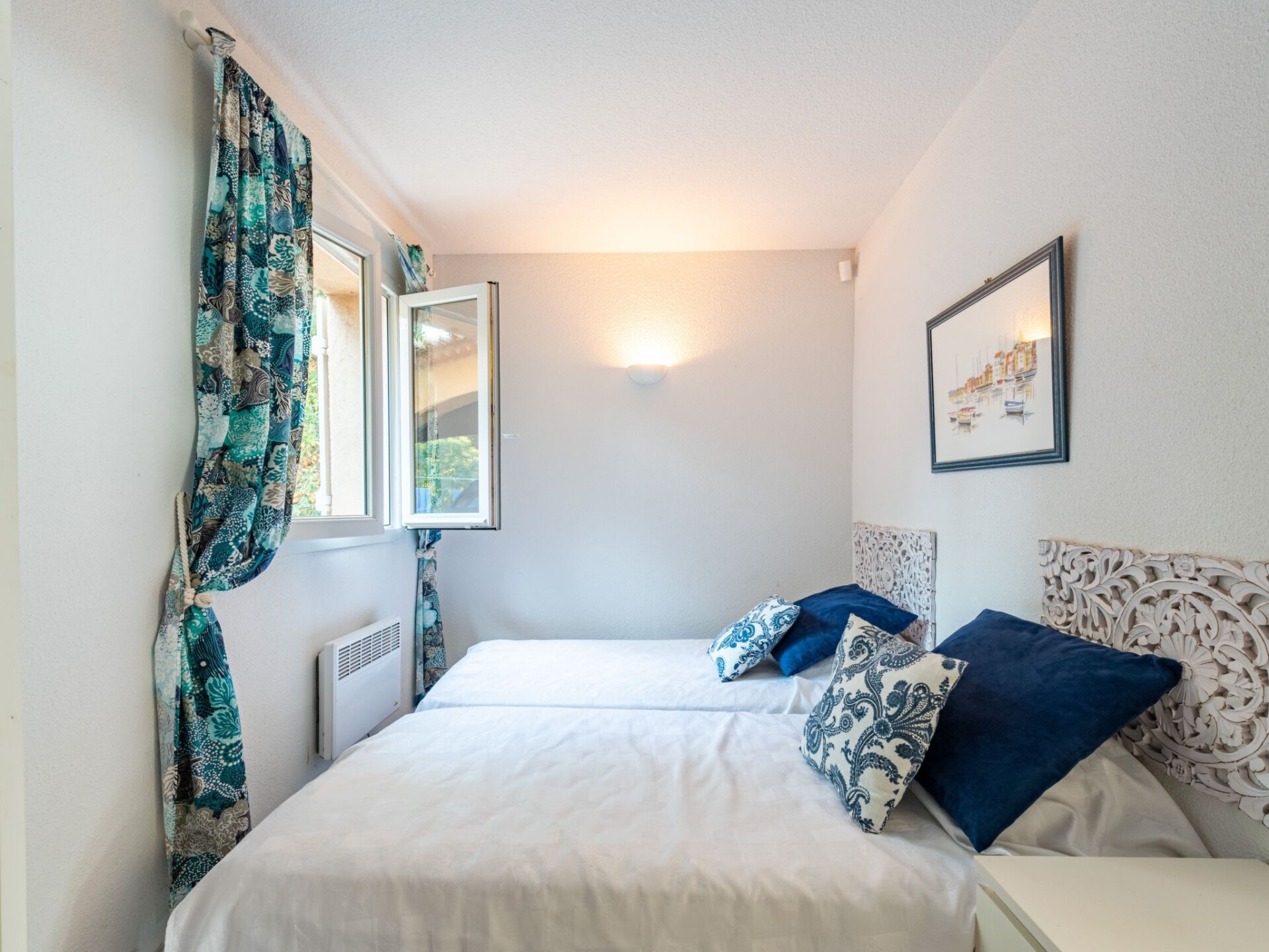 Huis 4-kamers 110 m2 op 2 verdiepingen, op het zuidwesten gelegen. Comfortabel en mooi ingericht: woon-/eetkamer met panoramavenster met open haard (alleen decoratie), eettafel en Sat-TV (Flatscreen TV). Uitgang naar het terras, naar het zwembad. 1 kamer met 1 2-pers bed (2 x 90 cm, lengte 190 cm), bad/WC. 1 kamer met 1 2-pers bed (2 x 90 cm, lengte 190 cm), zitbad/WC. Keuken (mini-oven, afwasmachine, 4 keramische glas kookplaten, broodrooster, waterkoker, magnetron, diepvriezer, elektrische koffiemachine, pads voor de koffiemachine (Expresso) extra). Bovenverdieping: 1 kamer met 1 2-pers bed (140 cm, lengte 190 cm), bad, bidet, aparte WC, elektrische verwarming en air-conditioning. Uitgang naar het balkon, naar het terras. Balkon 6 m2, op het zuiden gelegen, terras 12 m2, overdekt, op het zuiden gelegen en op het westen gelegen terras 12 m2. Terrasmeubelen, balkonmeubilair, elektrische barbecue, ligstoelen (6). Zeer mooi uitzicht op zee en het landschap. Ter beschikking: wasmachine, strijkijzer. Internet (WiFi, gratis). Parkeerplaats (overdekt, omheind, 2 Auto's). Rookmelders.