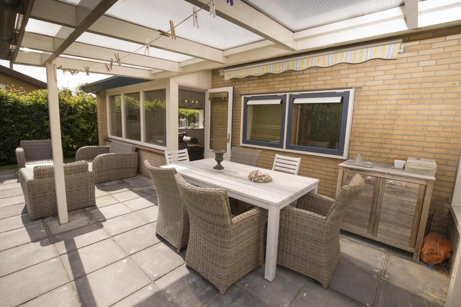 De badkamer beschikt over een wasmachine. Het toilet is apart. Tuin Heerlijke omheinde tuin met veranda. Op sommige plaatsen is het een lage afscheiding. De tuin ligt op het zuiden en biedt veel privacy. Huisdieren Huisdieren zijn in overleg toegestaan! Let op! Linnengoed is niet standaard bij uw boeking inbegrepen. U dient dit zelf mee te nemen of bij ons te huren. U kunt linnengoed bij uw boeking bijboeken.