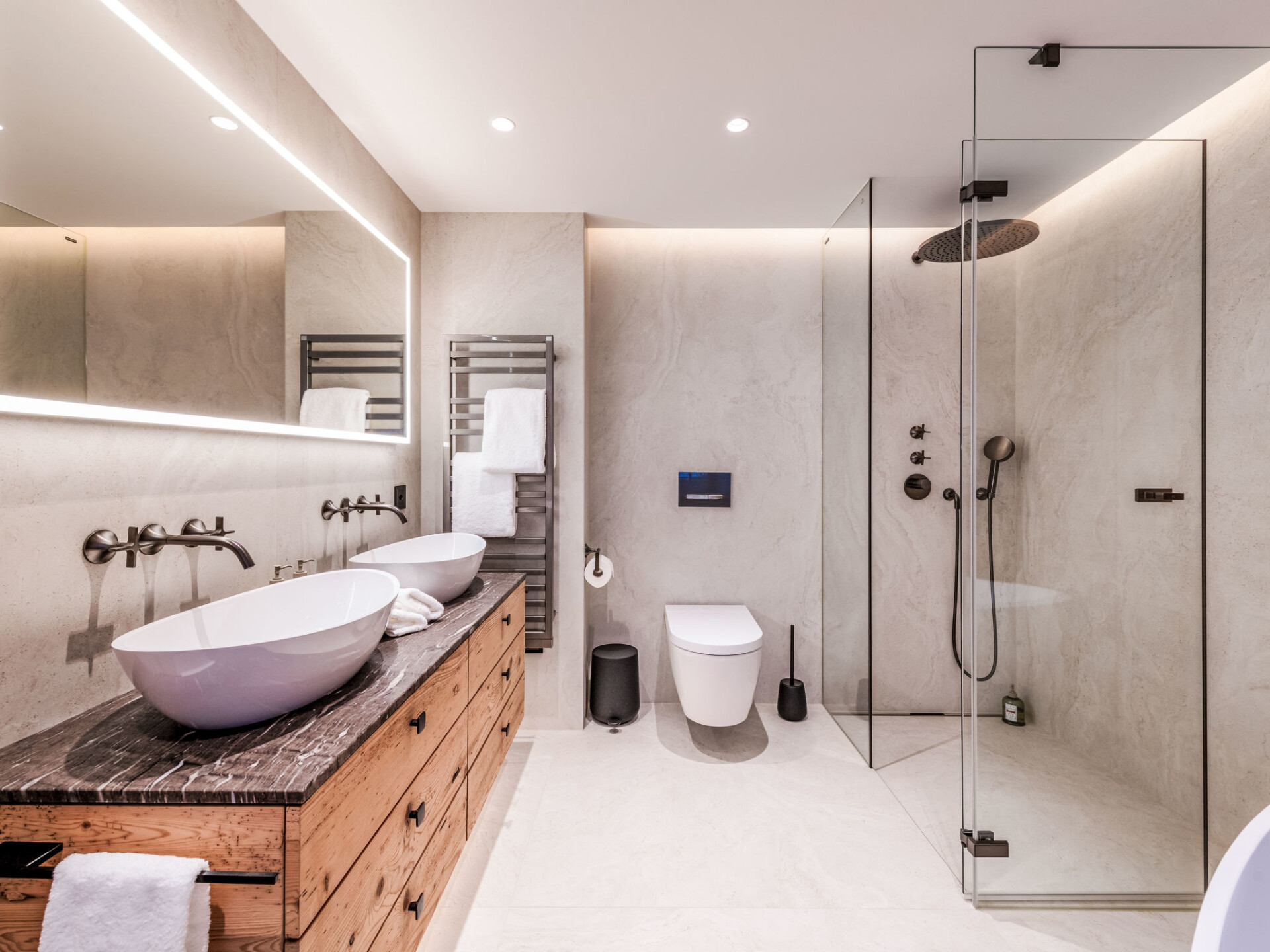 Chalet 8-kamers 405 m2 op 3 verdiepingen. Luxueus en stijlvol ingericht: 1 kamer met 1 2-pers bed, bad/douche/WC en dubbele wastafels. 1 kamer met 1 2-pers bed, bad/douche/WC en dubbele wastafels. 1 kamer met 2 bedden en douche/WC. Vloerverwarming. Souterrain: 1 kamer met 1 2-pers bed. Bad/douche/WC, dubbele wastafels. Bovenverdieping: groot woonkamer met open haard, eettafel en TV. Open keuken (oven, afwasmachine, 4 inductiekookplaten, broodrooster, waterkoker, magnetron, diepvriezer, elektrische koffiemachine) met eettafel. Aparte WC. Balkon 80 m2, terras 30 m2. Balkonmeubilair, ligstoelen (3). Zeer mooi panoramazicht op de bergen. Ter beschikking: wasmachine, droger, sauna, haardroger. Internet (WiFi, gratis). Rookvrij huis.