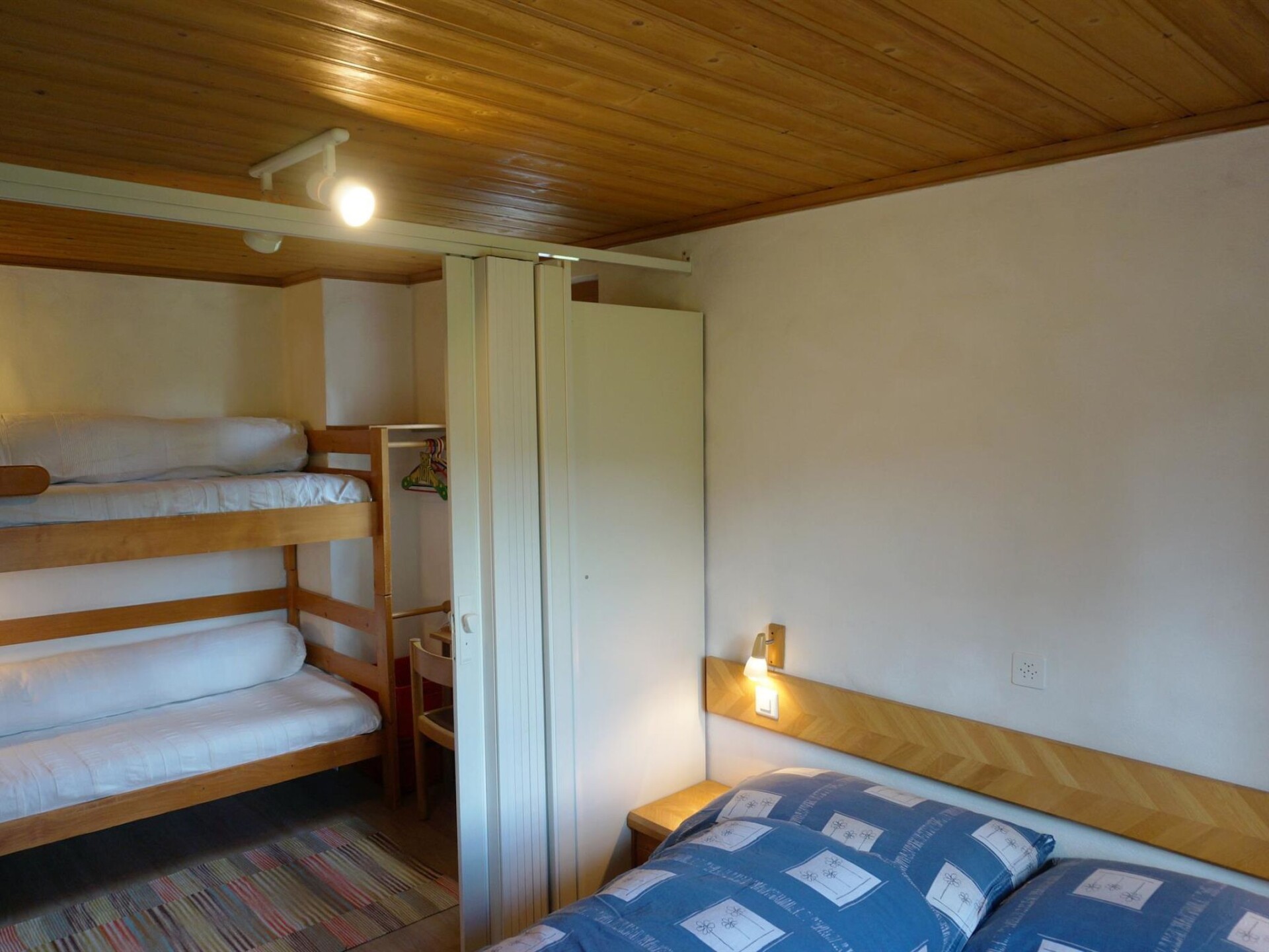 Living room with sofa which converts into a conventional bed (160x200cm), TV, telephone, radio and WiFi. Open-plan kitchen among other things furnished with refrigerator with freezer, coffee machine with capsules (Delizio) as well as a fondue- and raclette-set. Bedroom with a double bed (160x200cm) and a bunk bed (2x90x200cm), can be separated by a folding door. Bathroom with shower/WC.