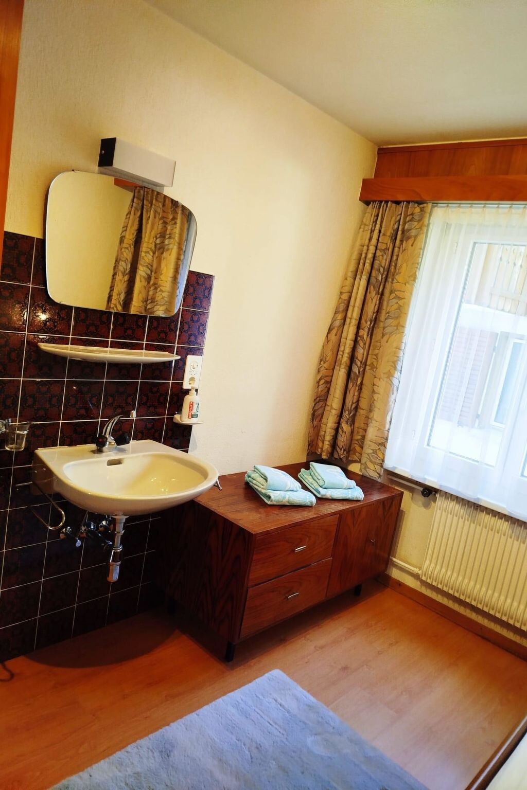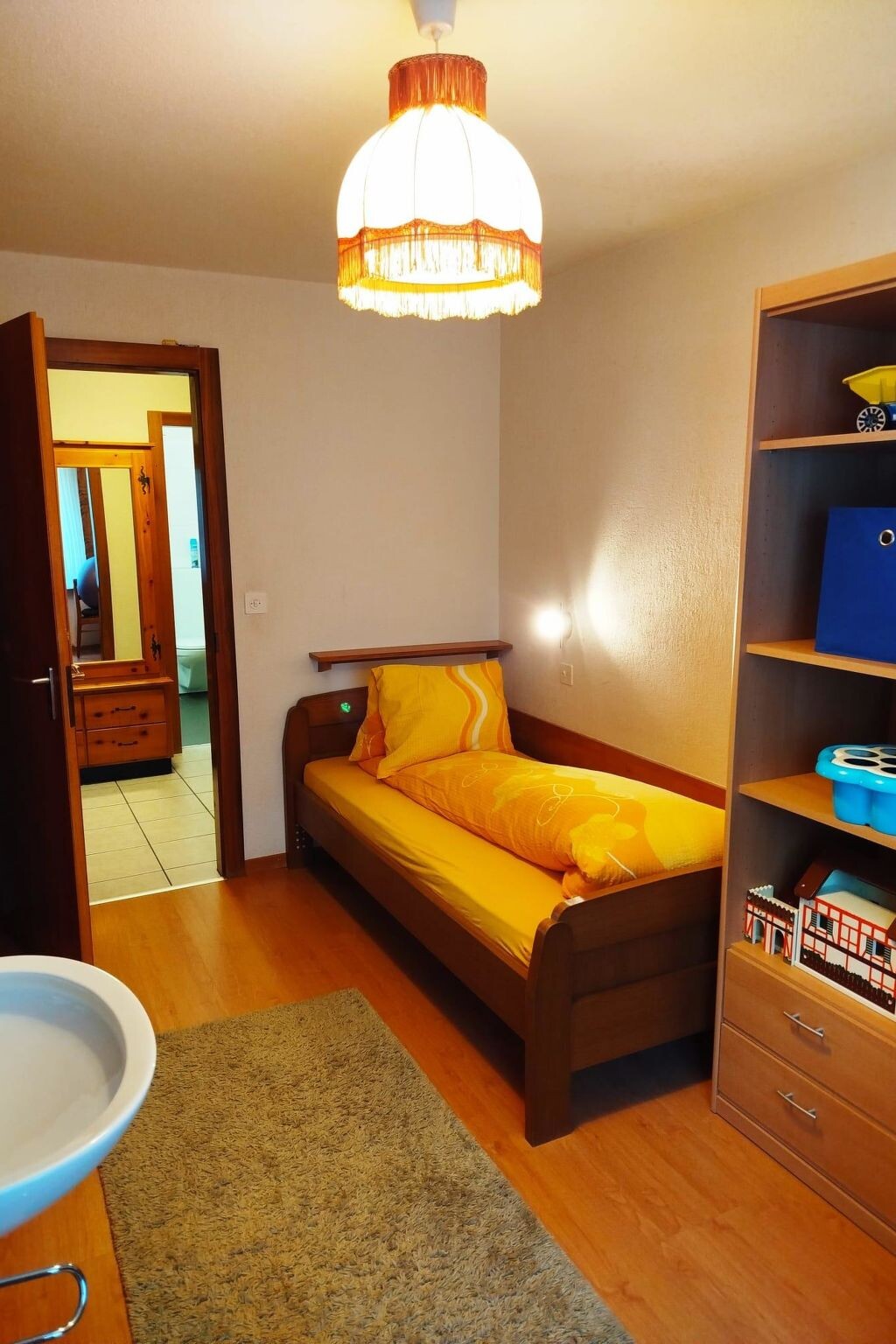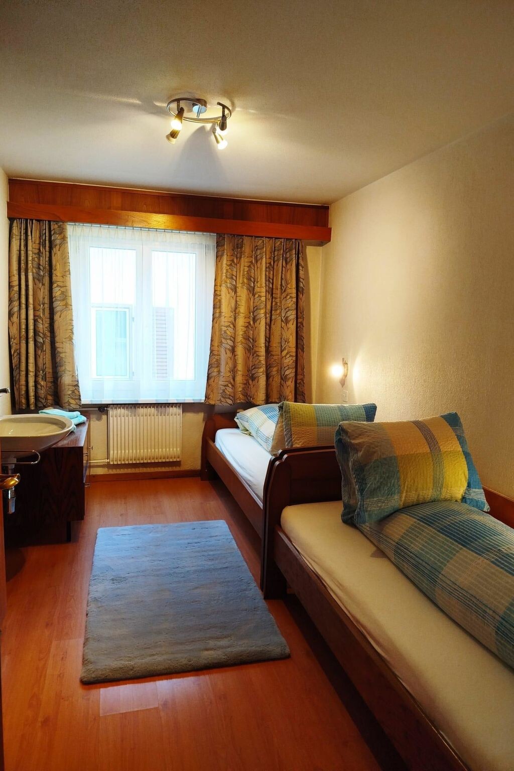 The 5.5 room apartment features 4 bedrooms, 1 living room, 1 kitchen, and 2 bathrooms. All rooms can be accessed from a spacious hallway. The apartment has two bathrooms (1st with shower and toilet, 2nd with bathtub, toilet). Each bedroom offers ample storage space for your clothing and also has a sink and a mirror; some rooms have a desk & chest of drawers. Two bedrooms are equipped with double beds (180 x 200 cm and 160 x 200 cm). Two other bedrooms offer single beds (1-bed and 2-bed rooms separately). Upon request, a baby cot can be set up for a fee (or we are happy to provide additional children's items). Beautiful views are offered by two balconies on the south and east sides. The kitchen is fully equipped (fridge with freezer, dishwasher, filter coffee machine, and fondue set, etc.). Of course, there is a large table with six chairs for you. In the living room, there is a larger corner sofa with a table and a living room wall with a flat-screen TV.
