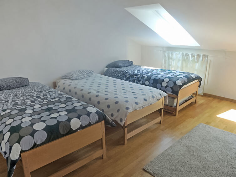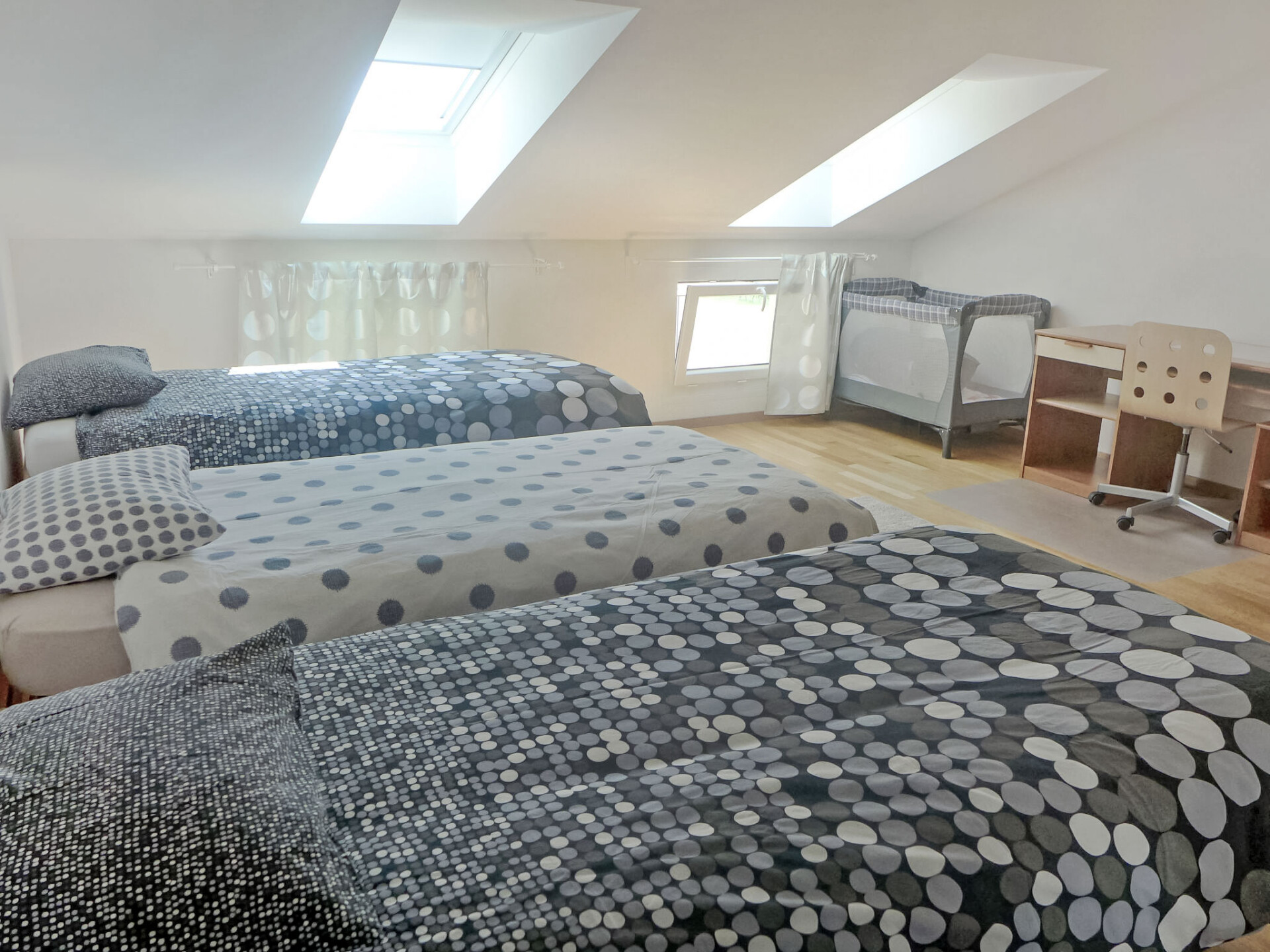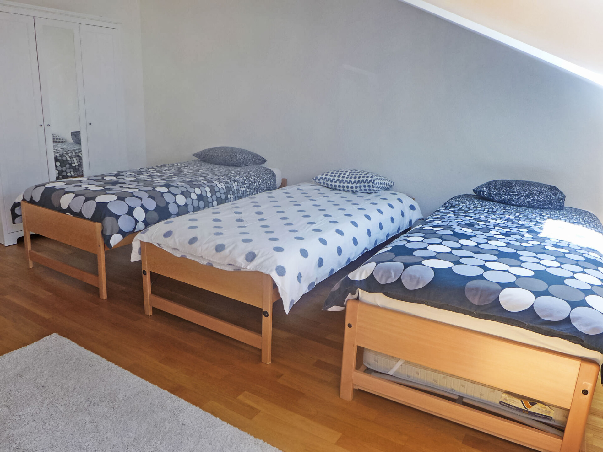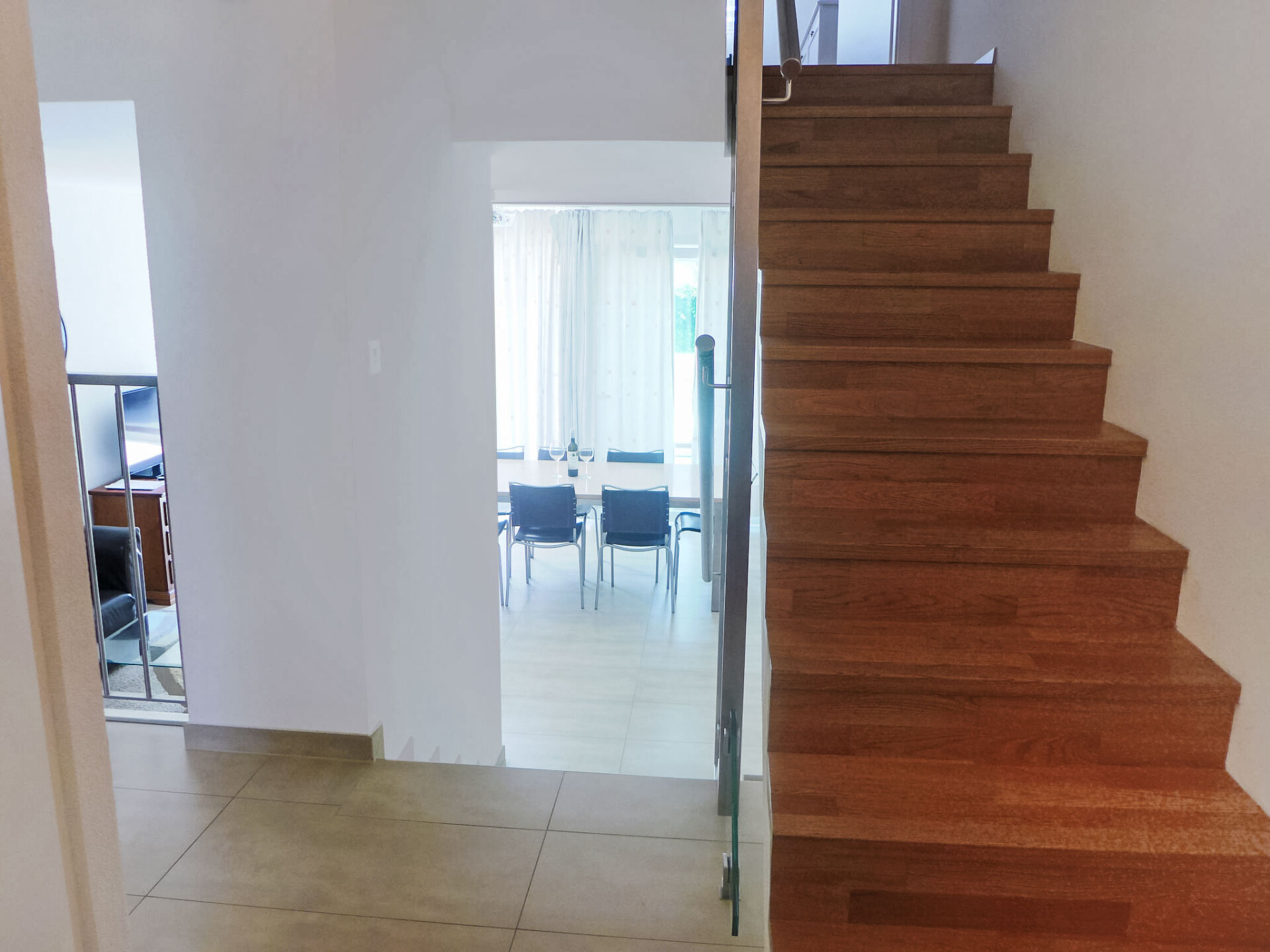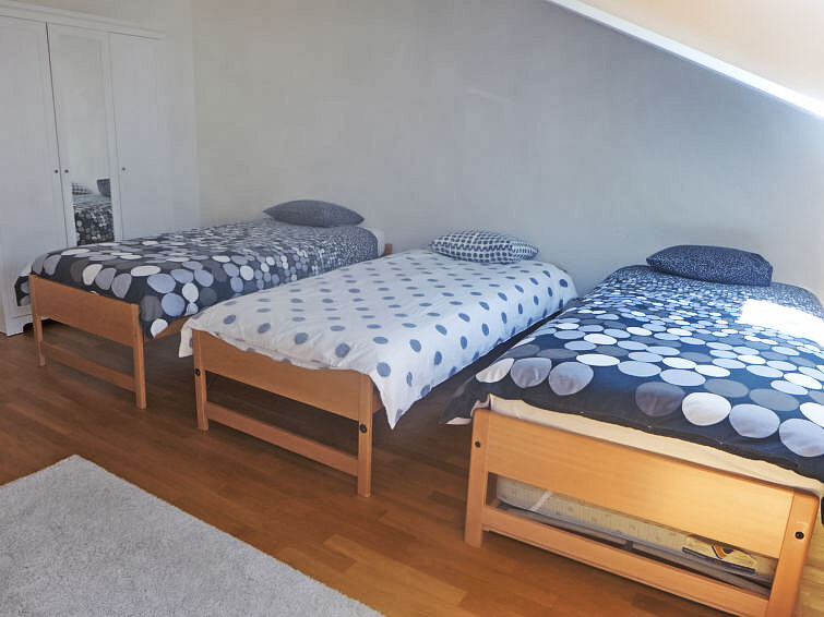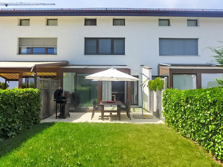 Huis in een rij 5-kamers 190 m2 op 3 verdiepingen. Comfortabel en smaakvol ingericht: woon-/eetkamer, op 2 verdiepingen met wintertuin met Digitale TV, Flatscreen TV en stereo-installatie. Uitgang naar de tuin. Open keuken in de hal (oven, afwasmachine, 4 keramische glas kookplaten, broodrooster, waterkoker, magnetron, diepvriezer, elektrische koffiemachine, raclette oven, fondue Set (kaas)) met eettafel. Souterrain: aparte WC. Bovenverdieping: 1 kamer met 1 2-pers bed (1 x 160 cm, lengte 200 cm). Bad/WC, dubbele wastafels. 2e Verdieping: 2 kamers, elke kamer heeft 1 2-pers bed (1 x 140 cm, lengte 200 cm). Zolderverdieping: 1 2-pers. kamer met afgeschuinde daken met panoramavenster met 3 bedden en douche/WC. Tuin 160 m2. Barbecue, ligstoelen, bergruimte. Beperkt uitzicht op het meer en het landschap. Ter beschikking: wasmachine, droger, strijkijzer, kinderstoel. Internet (Internet (WiFi), gratis). Parkeerplaats, garage. Niet rokers woning.