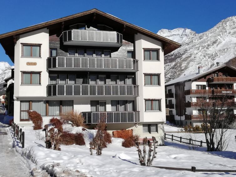 Very nice 3.5 room apartment (58 m2), 2nd floor, 2 double bedrooms, 1 living room with 1 bed, flat screen with cable TV, radio, free WiFi, modern bathroom with shower/ WC and hairdryer, open kitchen with dishwasher, oven, ceramic stove, Fridge with freezer, kettle, dining area, south and east-facing balcony with free views of the mountains and glaciers. Included in the price: Heated ski and boot room near the cable cars. Cable cars and post bus in summer with the SaastalCard free of charge (without metro and summer ski), stop for the ski bus next to the house (free)